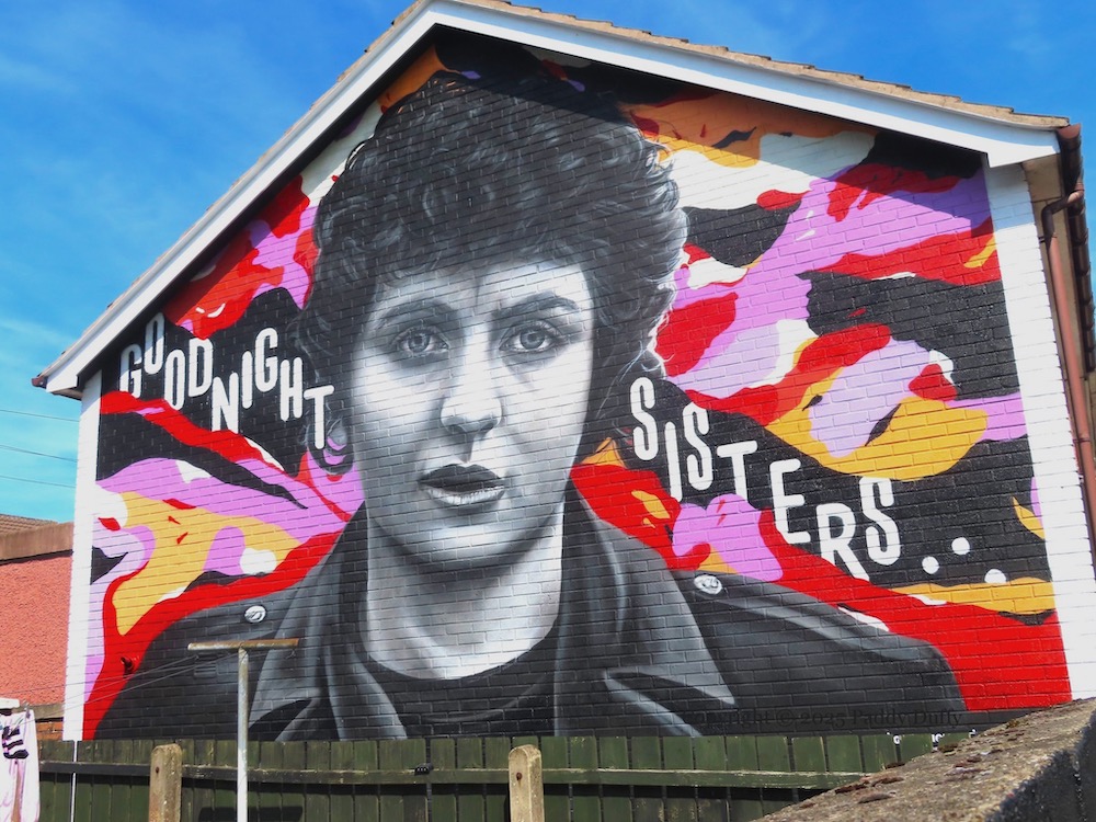The mural was painted by Peaball (web) on a gable in Lisfannon Park and is visible from Lecky Road. The portrait of McCafferty appeared on the cover of (the Penguin Ireland edition of) her autobiography Nell.