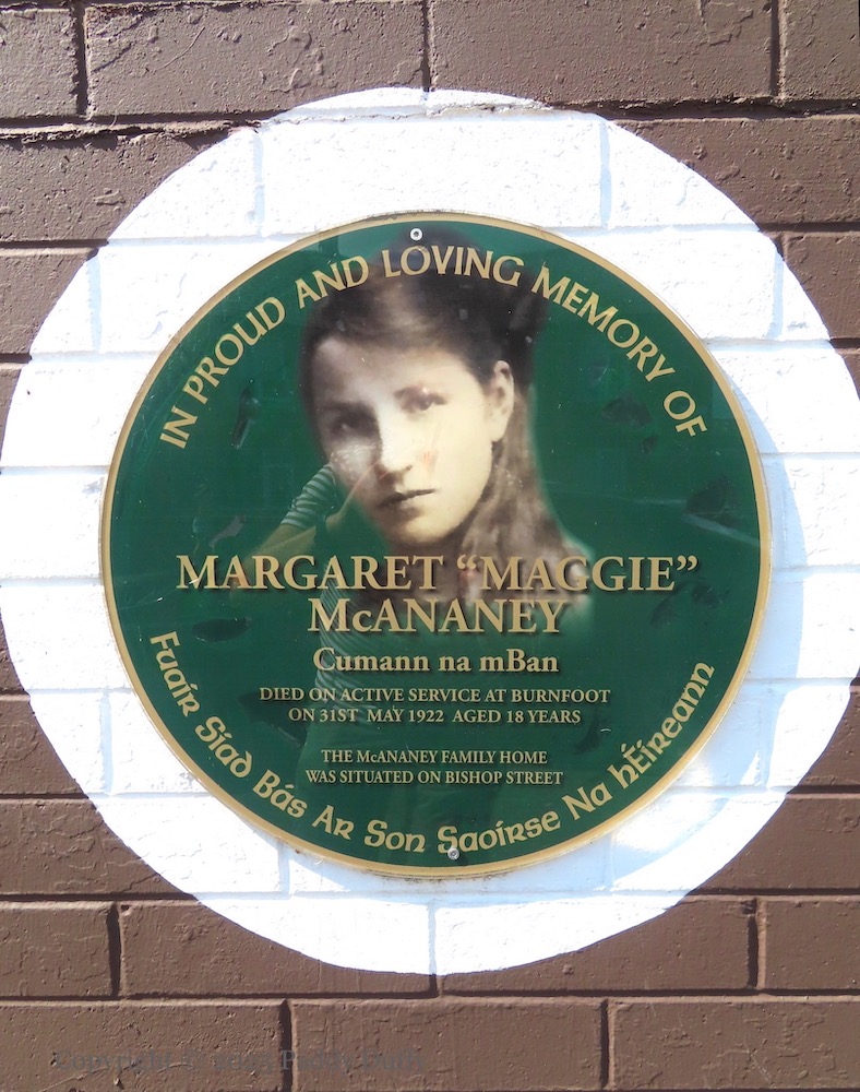 “In proud and loving memory of Margaret “Maggie” McAnaney, Cumann na mBan, died on active service at Burnfoot on 31st May 1922, aged 18 years. The McAnaney family home was situated on Bishop Street. Fuaır sıad bás ar son saoırse na hÉıreann.”