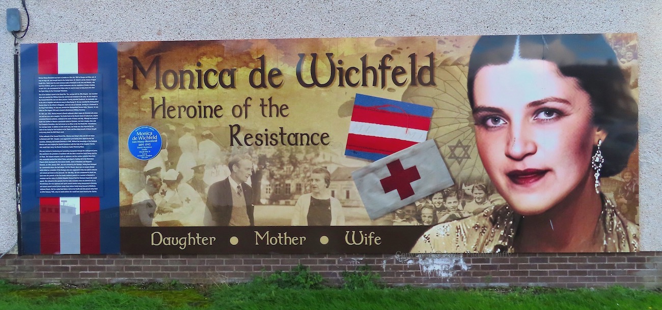 “Monica de Wichfeld, heroine of the resistance, daughter, mother, wife”. The blue plaque to Monica Massy-Beresford is at the Kinawley Holy Trinity church in Derrylin, Fermanagh, (Street View), near where she grew up. She moved to Denmark upon her marriage and had a long and varied career in the Danish resistance to the German occupation in WWII, raising money for the Communists, using her estate to shelter fleeing families and receive arms and train volunteers, and eventually heading the regional group on Lolland (WP).