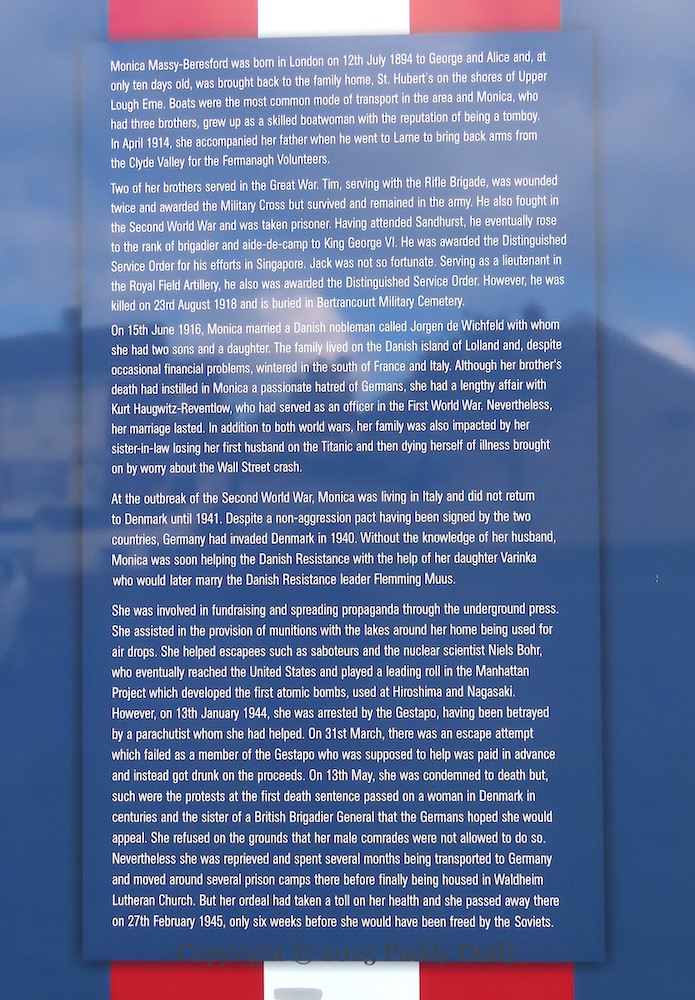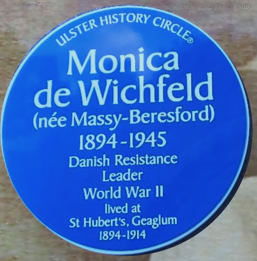 “Monica Massy-Beresford was born in London on 12th July 1894 to George and Alice and, at only ten years old, was brought back to the family home, St Hubert’s on the shores of Upper Lough Erne. Boats were the most common mode of transport in the area and Monica, who had three brothers, grew up as a skilled boatwoman with the reputation of being a tomboy. In April 1914, she accompanied her father when he went to Larne to bring back arms from the Clyde Valley for the Fermanagh Volunteers. … On 15th June 1916, Monica married a Danish nobleman called Jorgen de Wichfeld with whom she had two sons and a daughter. The family lived on the Danish island of Lolland and, despite occasional financial problems, wintered in the south of France and Italy. Although her brother’s death had instilled in Monica a passionate hatred of Germans, she had a lengthy affair with Kurt Huagwitz-Reventlow, who had served as an officer in the First World War. Nevertheless, her marriage lasted. … At the outbreak of the Second World War, Monica was living in Italy and did not return to Denmark until 1941. Despite a non-aggression pact having been signed by the two countries, Germany had invaded Denmark in 1940. Without the knowledge of her husband, Monica was soon helping the Danish Resistance with the help of her daughter Varinka who would later marry the Danish Resistance leader Flemming Muus. She was involved in fundraising and spreading propaganda through the underground press. She assisted in the provision of munitions with the lakes around her home being used for air drops. She helped escapees such as saboteurs and the nuclear physicist Niels Bohr, who eventually reached the United States and played a leading roll [role] in the Manhattan Project which developed the first atomic bombs, used at Hiroshima and Nagasaki. However, on 13th January 1944, she was arrested by the Gestapo, having been betrayed by a parachutist whom she had helped. On 31st March, these was an escape attempt which failed as a member of the Gestapo who was supposed to help was paid in advance and instead got drunk on the proceeds. On 13th May, she was condemned to death but, such were the protests at the first death sentence passed on a woman in Denmark in centuries and the sister of a British Brigadier General that the Germans hoped she would appeal. She refused on the grounds that her male comrades were not allowed to do so. Nevertheless she was reprieved and spent several months being transported to Germany and moved around several prison camps there before finally being housed in Waldheim Lutheran Church. But her ordeal had taken a toll on her health and she passed away there on 27th February 1945, only six weeks before she would have been freed by the Soviets.