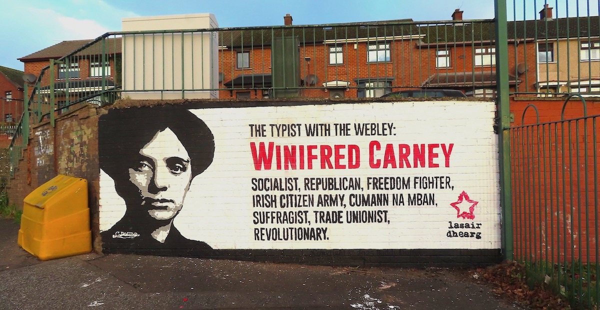 Winifred Carney was a qualified secretary and typist, and became secretary of the Irish Textile Workers’ Union in 1912, in which position she met James Connolly, who was secretary of the Belfast branch of the ITGWU. She was a member of Cumann Na mBan and participated in the Easter Rising of 1916. Carney was in the GPO when it was taken over and was among those who surrendered at the end; during the occupation she typed up dispatches from the Moore Street headquarters – this is how she was portrayed in the the 1916 Centenary mural.