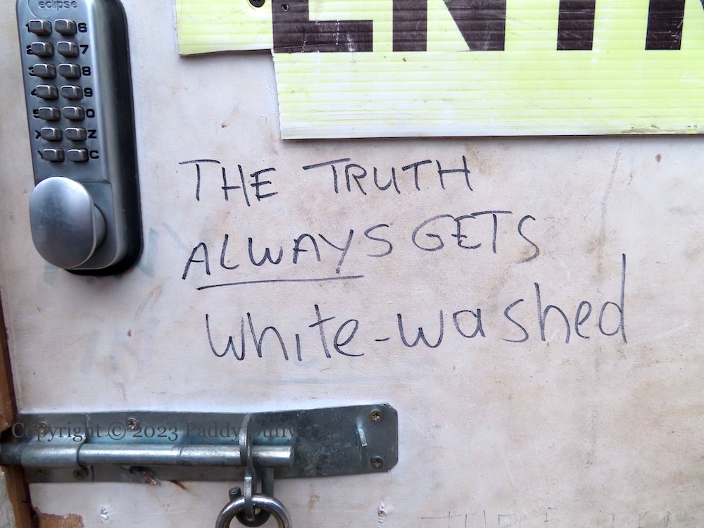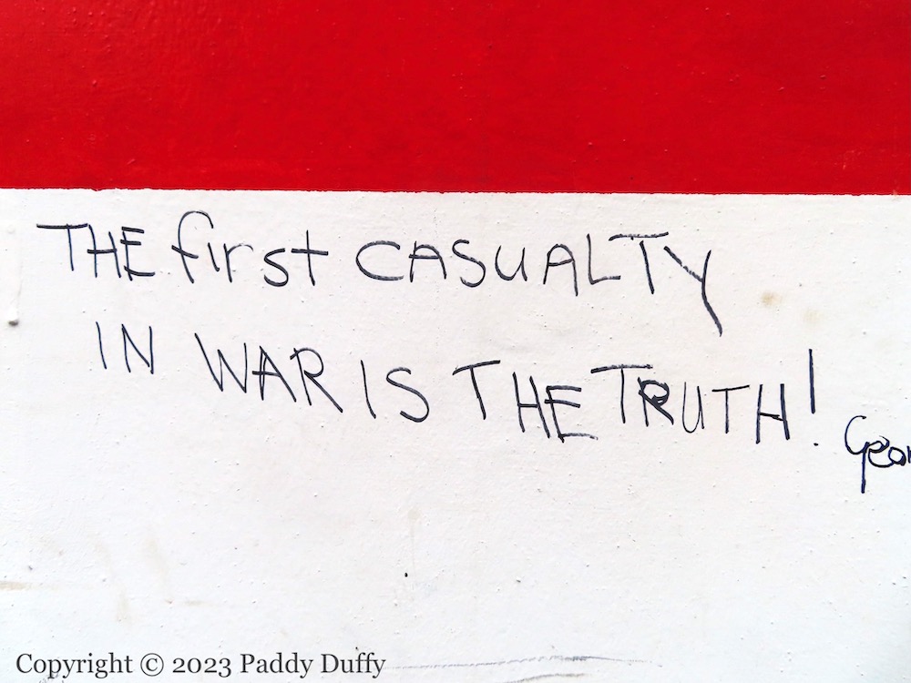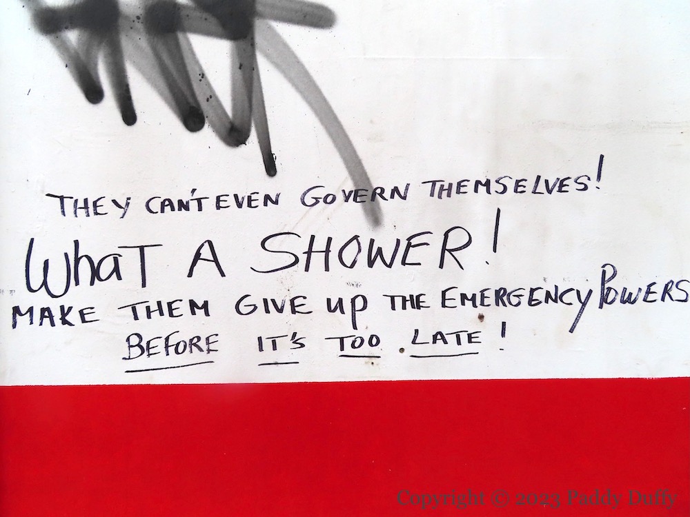Covid-era graffiti on a construction hoarding in College Street/Queen Street, Belfast city centre: