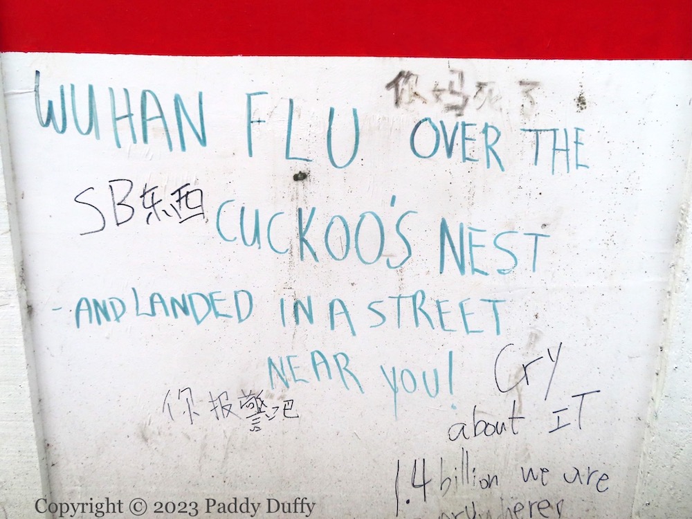 “Wuhan flu over the cuckoo’s nest and landed in a street near you!”,