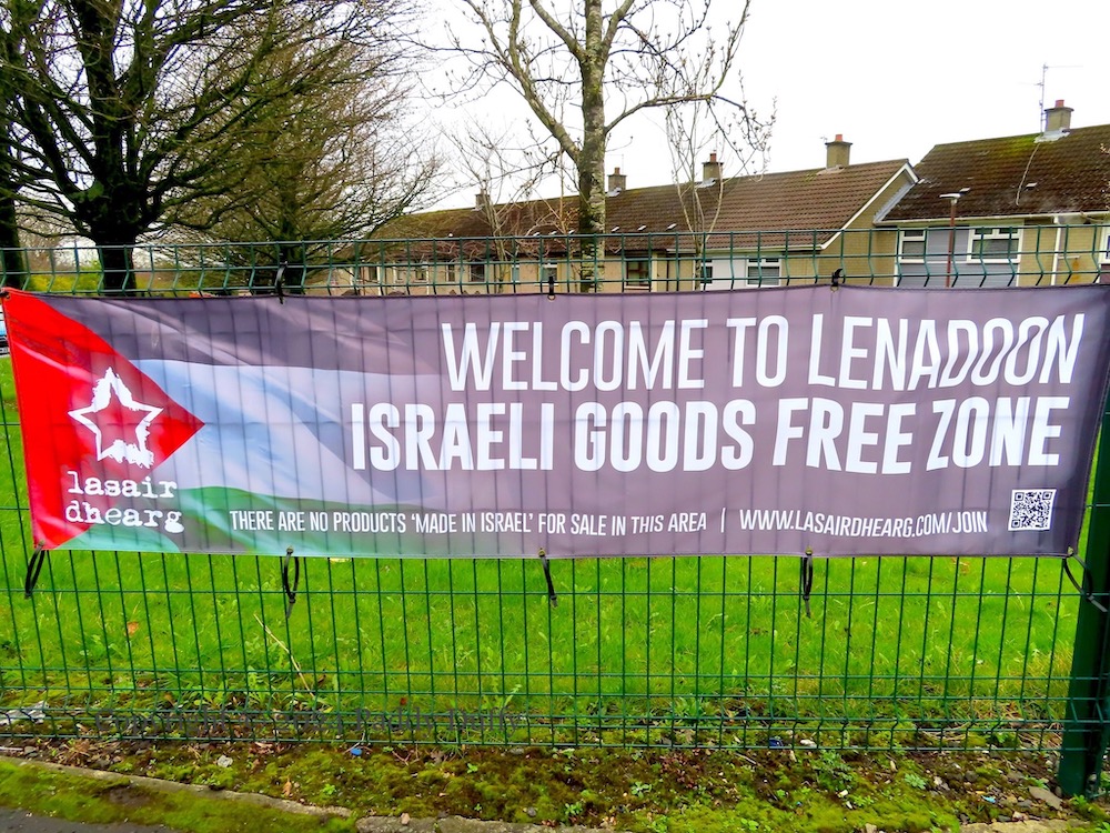 The final image is of a Lasaır Dhearg tarp in Lenadoon: “Israeli goods free zone – there are no products ‘Made in Israel’ for sale in this area”.
