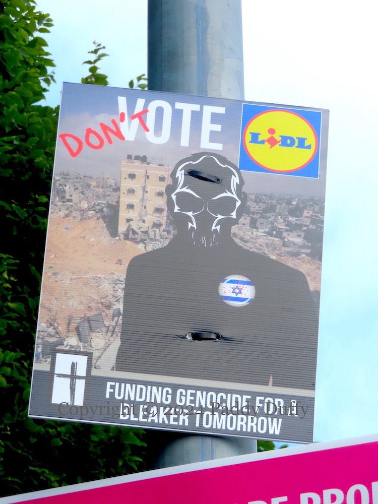 One of Lidl’s slogans (and a “corporate responsibility objective” of the company) is to work “For a better tomorrow”. The electoral-style placard above urges “Don’t vote Lidl” and alleges that the company is “funding genocide for a bleaker tomorrow” and that its “policy is to fund apartheid, occupation, genocide” – perhaps through selling Israeli-made goods – particularly wipes made by Lupilu (ig video | Fb video | Fb | Change.org) – and through its parent company Schwarz’s acquisition of an Israeli cyber-security company.