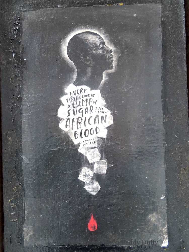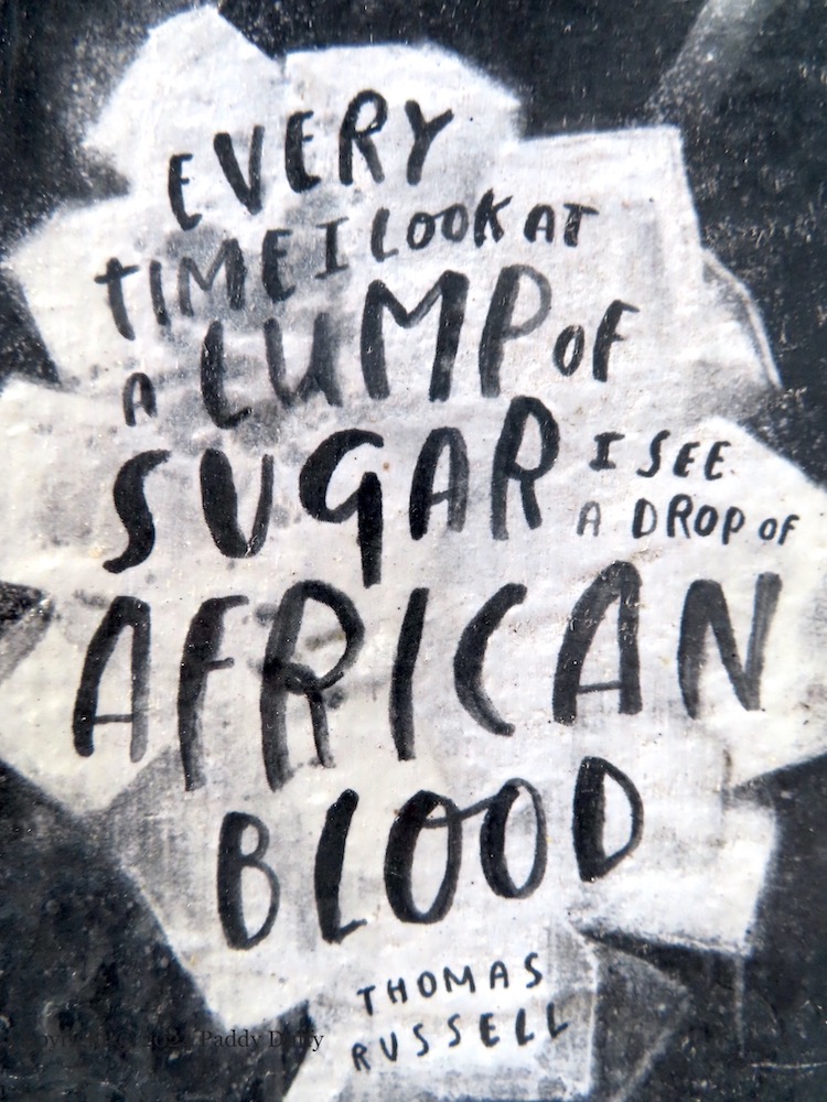 Peter Strain (web) produced illustrations for a number of entries in 2020 and 2022, including one from 2022 for Sugarhouse Entry. It quotes United Irishman Thomas Russell as saying, “Every time I look at a lump of sugar, I see a drop of African blood”.