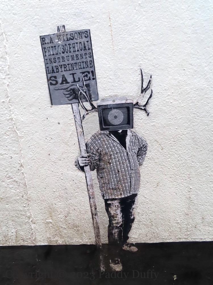 The piece below, in Joy’s Entry, shows a sign for “R. A. Wilson’s philosophical instruments labyrinthine sale!” It is probably by Leo Boyd – see The Farset Voice.