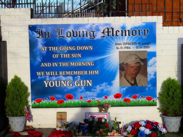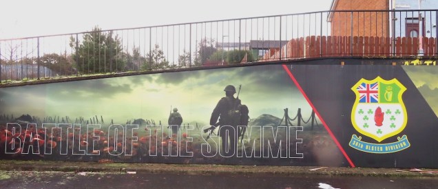 These are images of the sub-station at the green in the middle of Drumbeg. Above are children bearing messages of “happiness” and peace (a second trio of children on the right-hand side of the image above has been blotted out by a large pink splotch). The plaque in the top right reads, “A Shared Space & Services Re-Imaging Project supported by the European Union’s Peace IV Programme”.