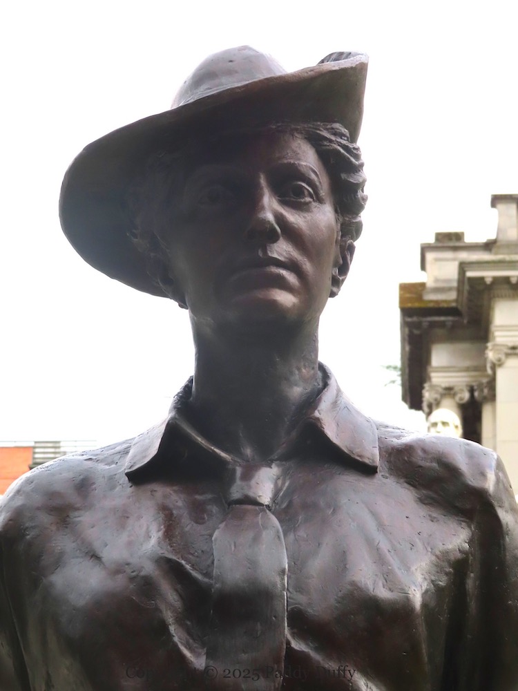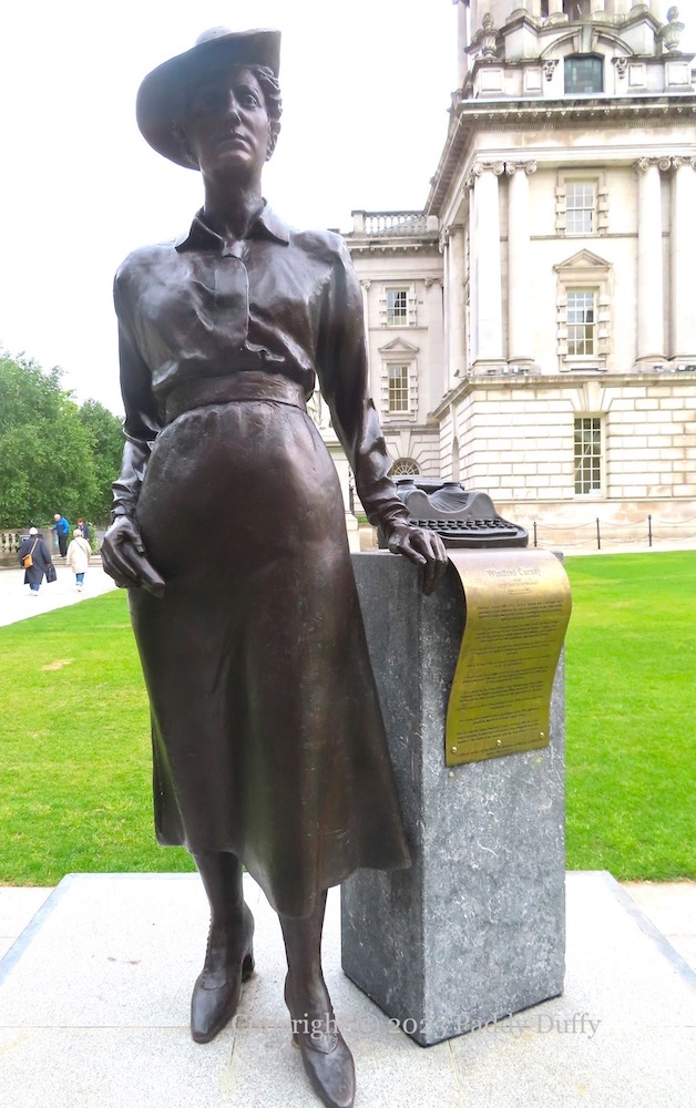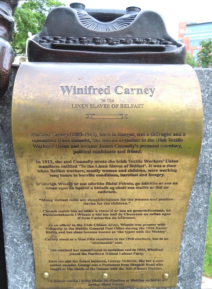 A statue to Winifred Carney was unveiled, along with another to Mary Ann McCracken, in the grounds of Belfast City Hall on Friday, March 8th (BCC). At her left hand is a typewriter. Carney was a qualified secretary and typist, and became secretary of the Irish Textile Workers’ Union in 1912, in which position she met James Connolly, who was secretary of the Belfast branch of the ITGWU. The 1913 manifesto addressed ‘To The Linen Slaves Of Belfast’ (marxists.org), exhorting “our toiling sisters” in the mills to join the organisation, was signed by Carney, Connolly, and Ellen Gordon.