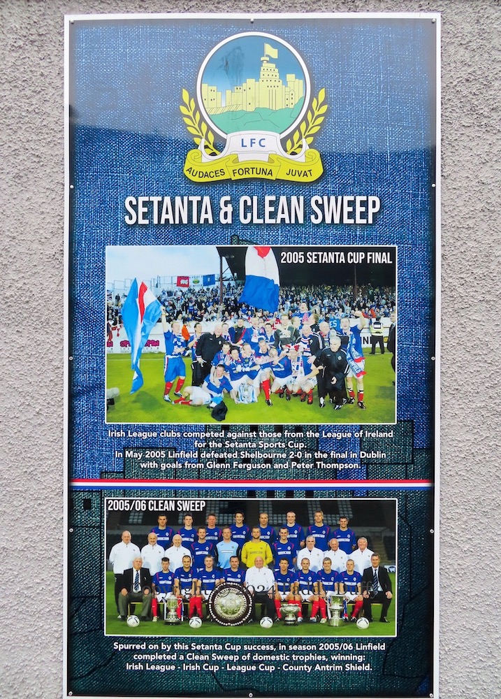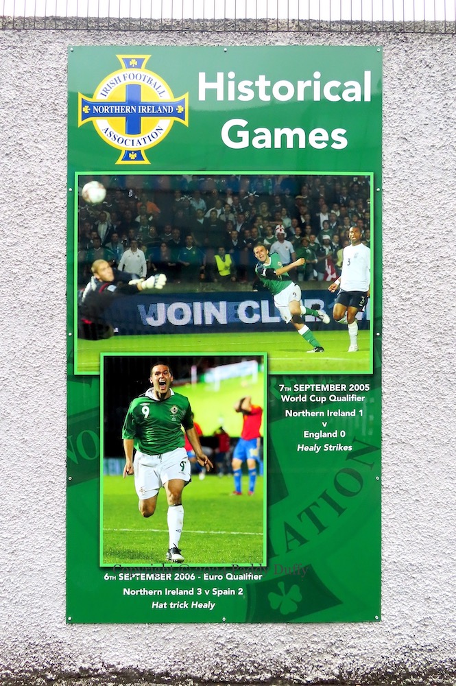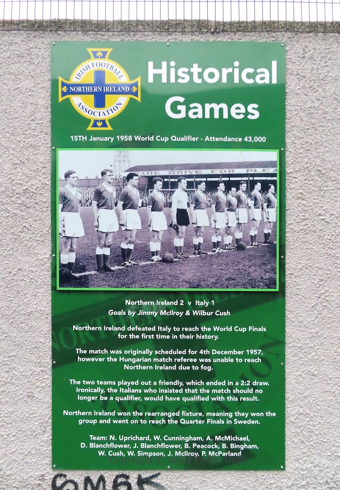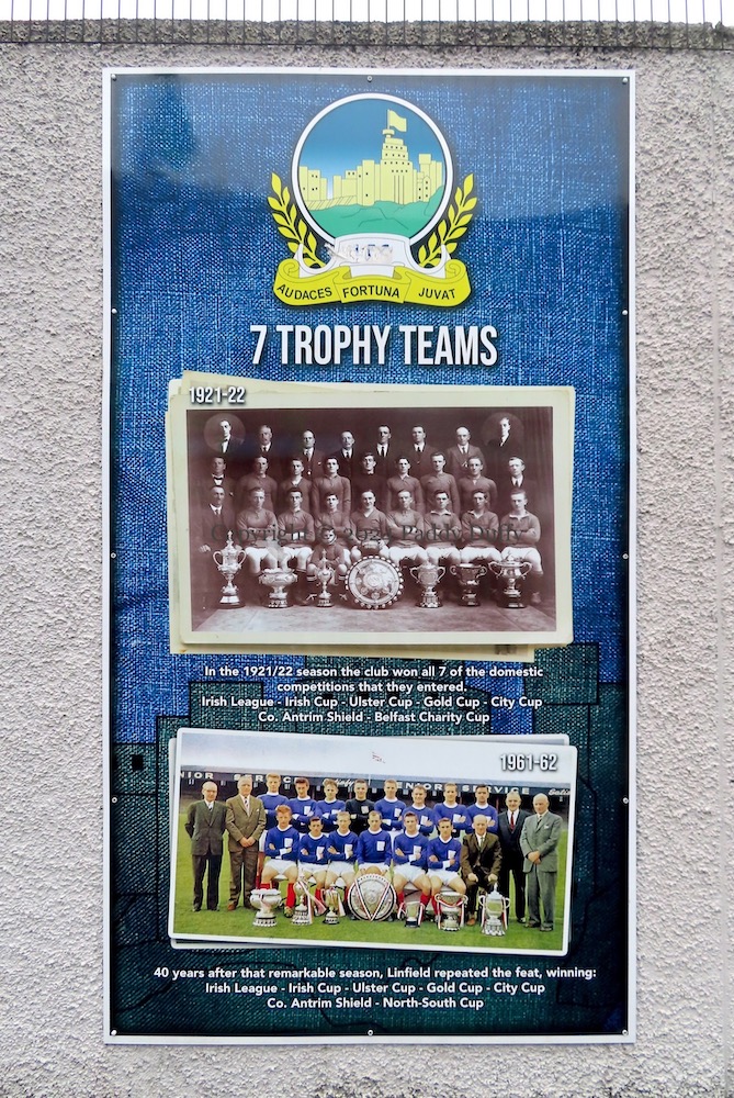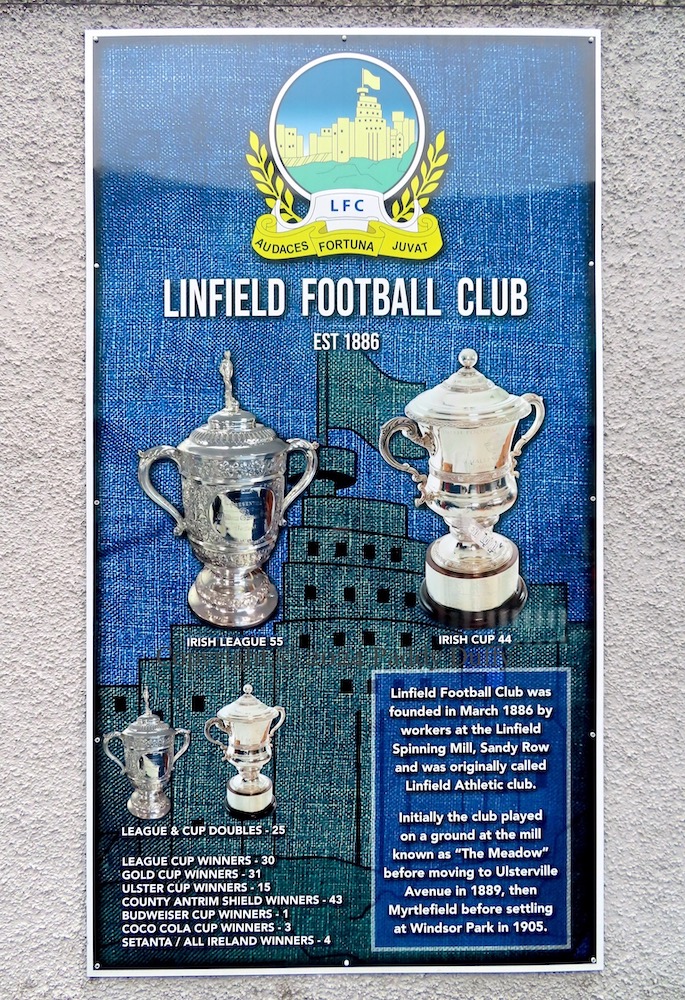 This is a gallery of the boards along the lane to the east of Windsor Park where Linfield and Northern Ireland play their soccer matches. Five describe “historical games” played by Northern Ireland at the ground (from 1958, 1975, 1981, 2005, and 2015) and five describe Linfield FC (the “7 trophy” teams of 1921 and 1961, ‘the blues in Europe’, a history of the club, the 2005-2006 season, and Captains).