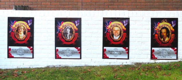 The main piece (above) shows photographs purporting to be of the 36th (Ulster) Division during WWI, above the title “Dulce et decorum est pro patria mori”/”It is Sweet and Honourable to die for one’s country” (which WWI poet Wilfred Owen called “the old lie“) and two epigrams: (left) “And you unborn then, remember that their luck, skill, and nerve where pushed to the limits and they were young like you” and (right) “They layed down the glory of their youth upon the altar of freedom”.