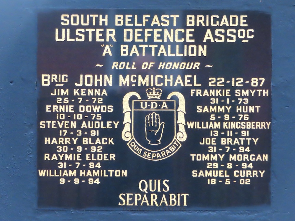The same thirteen names that appear on the South Belfast UDA A battalion “roll of honour” plaque in the McMichael memorial garden in City Way, off Sandy Row also appear in the small (4′ x 3′) reproduction of a mural (2005 M02408) from nearby Rowland Way, which was itself a repaint of an earlier (see 1995 M01183 and 2001 M01518) mural, though updated to note the “distinguished service” of Samuel Curry.