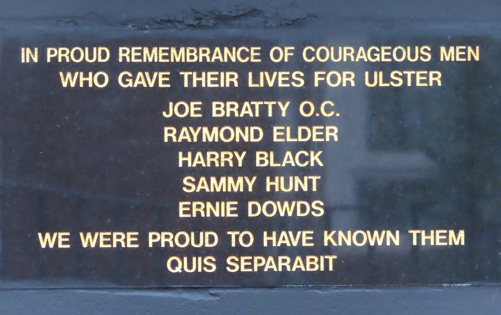 A little way into the complex we find a small memorial garden to two UVF volunteers, deceased post-Agreement: Lee Wilson and David Stewart.