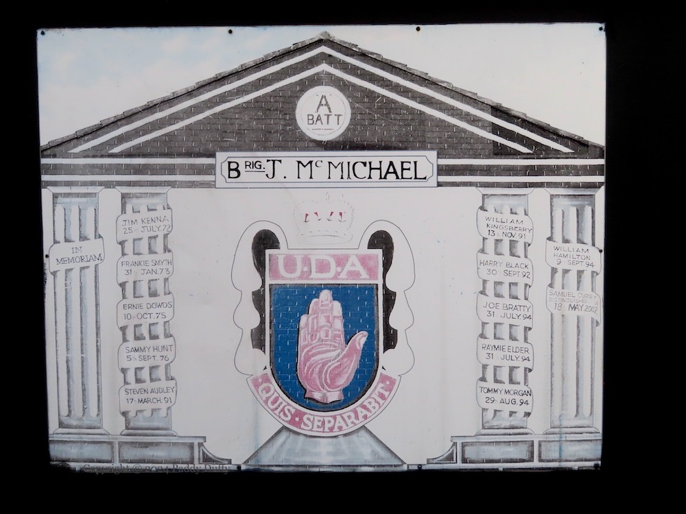 The South Belfast UDA/UFF commander John McMichael was killed by an IRA car bomb in 1987. In addition to organising a team of assassins in the 70s and 80s, he founded a Political Research Group and wrote two documents proposing an independent Northern Ireland. The memorial garden, shown in full in the image below, is just off Sandy Row, near the John McMichael Centre.