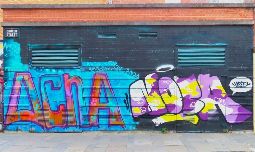 The works shown here are by Chain Gun Art (ig) (“Cheese, Please!”), Lost Lines (ig), Féoıl (ig), Rob Hilken (web), and Ana Fish (web). The Ana Fish piece is on shutters painted by Verz in 2012 – see North Street Will Rise Again.