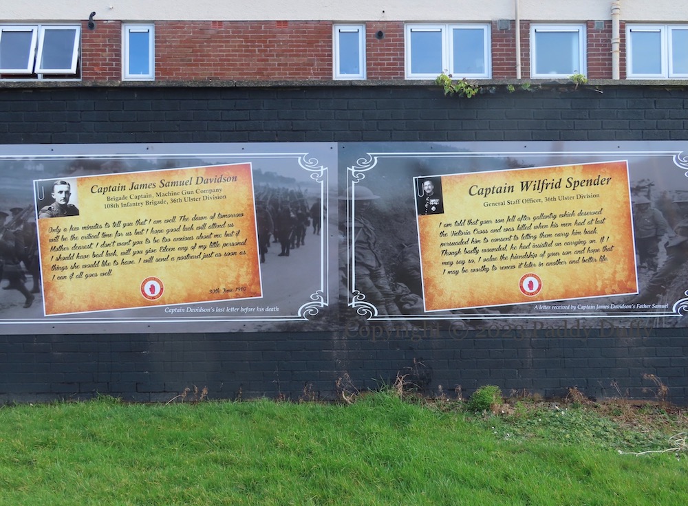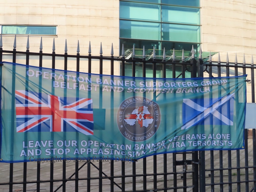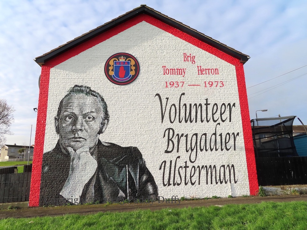 Despite the internal conflict over Herron’s position and profiteering, 25,000 people attended his funeral and hearkened to the words of the Reverend Ian Paisley (AP video | Patterson images). The AP video shows ranks of UDA volunteers marching in the procession; the mural was launched with (two) masked UDA volunteers flanking speaker Dee Stitt (BelTel).