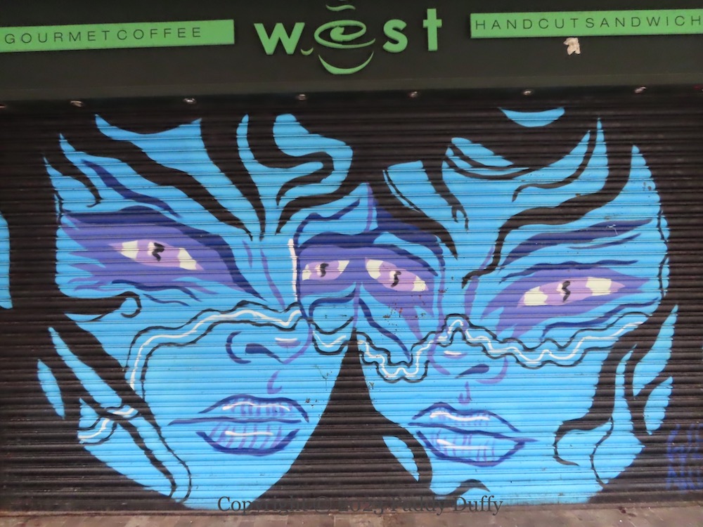 “The Spirits Of The Two Fountains” from Wee Nuls (web | ig), on one of the shutters below the Norwich Union building in the Fountain area of Belfast, based on the idea that there were two fountains in the street (Belfast Entries says there were three).
