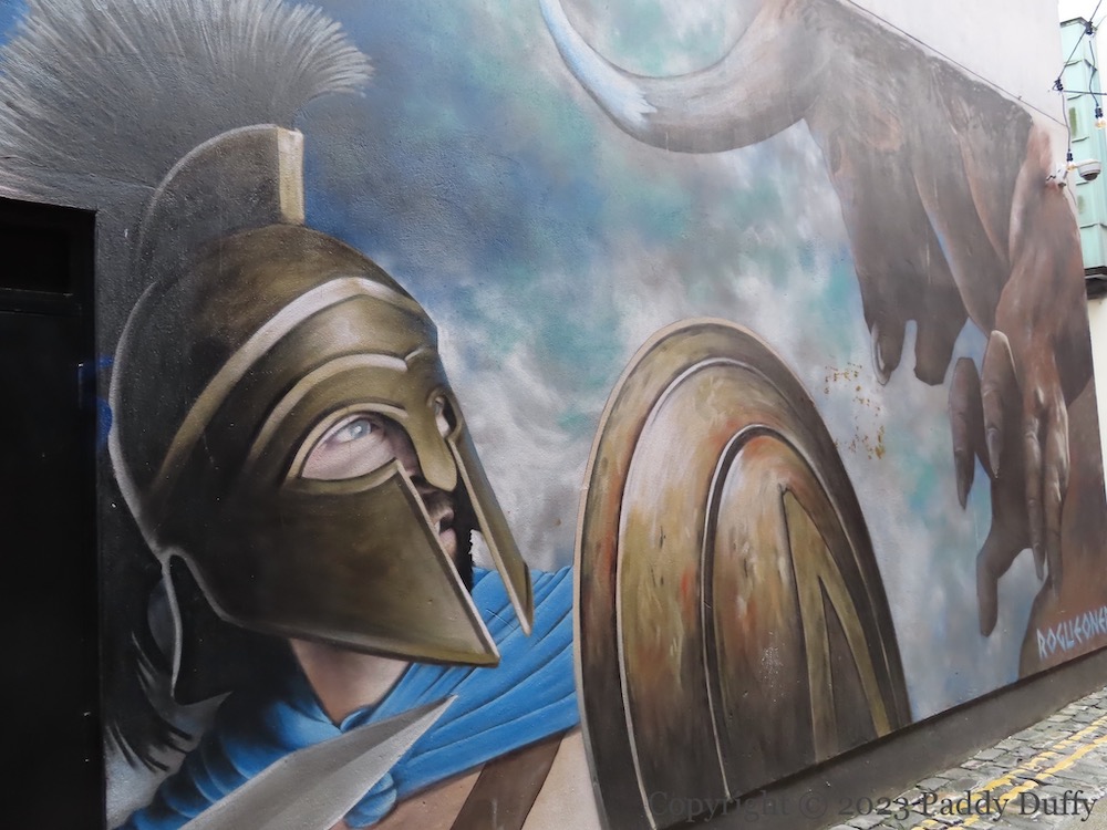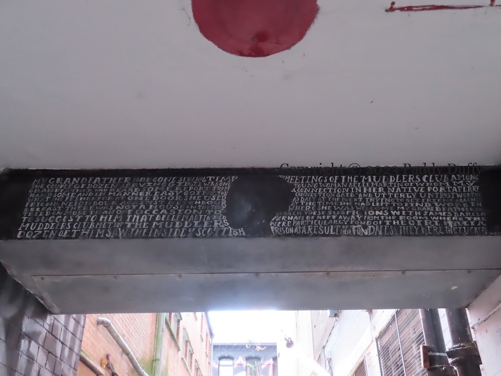 There is today a restaurant called The Muddlers’ Club, named after the society, in Warehouse Lane. Two of its murals are shown in The Eye Of Providence; for others see also God Approves Our Undertakings and The Wider Conspiracy in the Seosamh Mac Coılle Collection.
