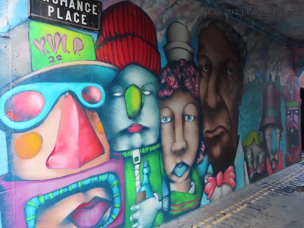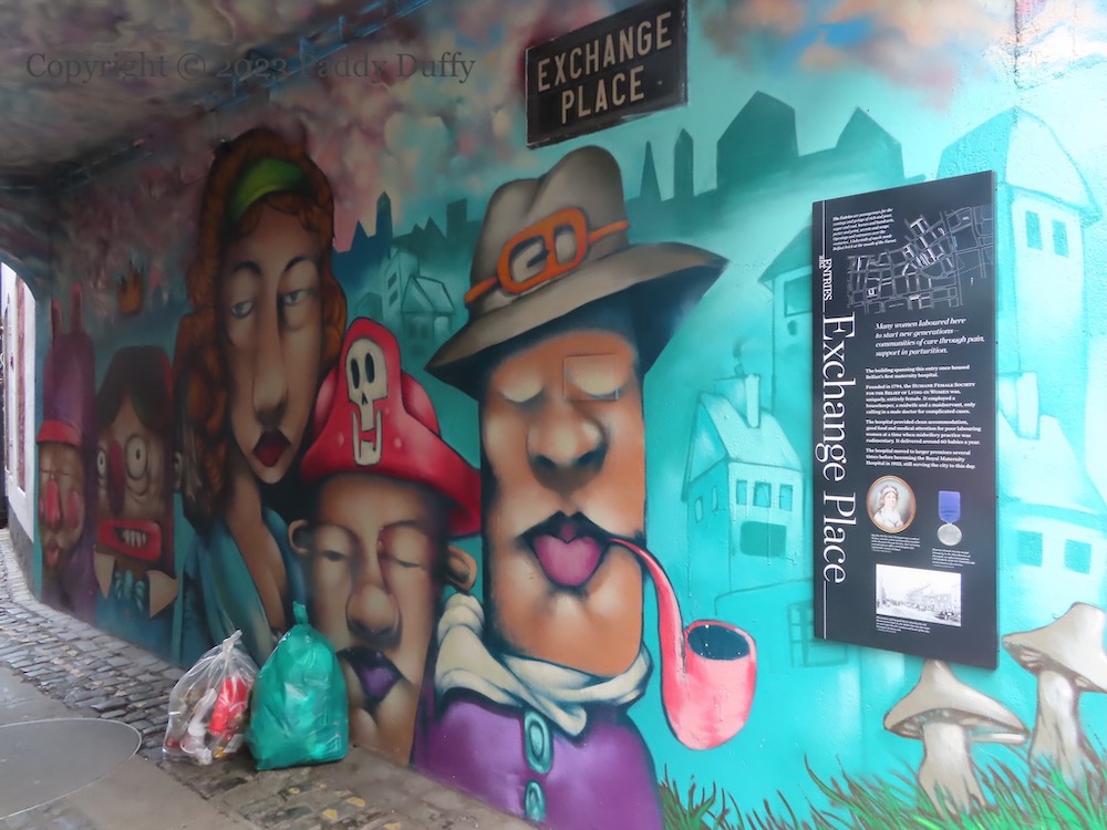 A gallery of faces from KVLR (ig) in Exchange Place, perhaps on their way to Belfast’s first maternity hospital, the Humane Female Society For The Relief Of Lying-In Women (Clifton House) which was in the building above these artworks.