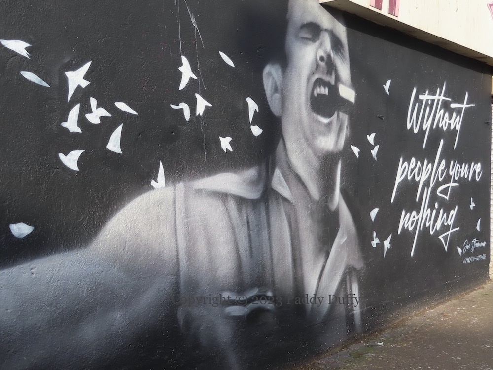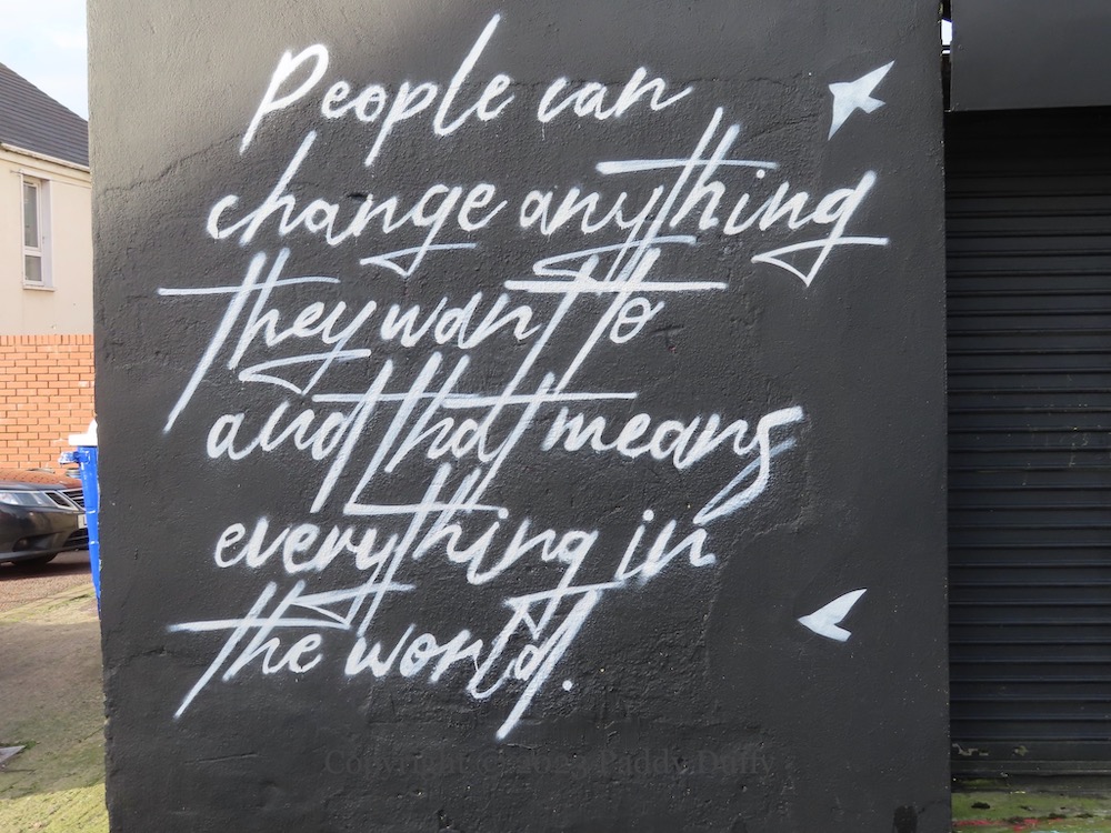 The true nature of the group was betrayed to the authorities in 1796 by Isabella “Belle” Martin, a serving girl in the tavern (Romanticsm Anthology | Belfast Entries | Belfast Media | Joe Baker). As the text in the Peter Strain mural above concludes, “Half a dozen of them saw the inside of a Scottish prison as a result” and the club dissolved. (The text surrounding Martin’s profile is from Glenn Patterson’s book, A Mill For Grinding Old People Young – this was the name of Peggy Barclay’s inn when she left the city centre for the Buttermilk Loney (now Skegoniell Avenue) on the Shore Road in north Belfast.