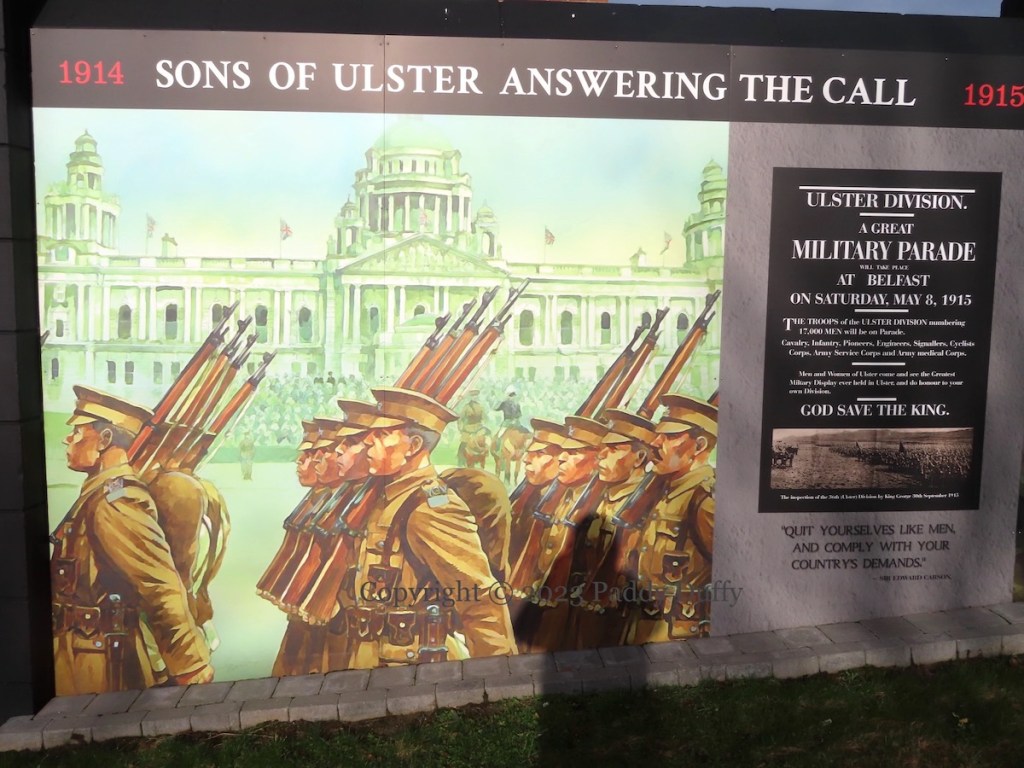1914 – Sons Of Ulster Answering The Call – 1915: “Ulster Division – a great military parade will take place at Belfast on Saturday, May 8, 1915. The troops of the Ulster Division numbering 17,000 men will be on parade. Cavalry, infantry, pioneers, engineers, signallers, cyclists corps, Army service corps and Army medical corps. Men and women of Ulster come and see the greatest military display every helf in Ulster, and do honur to your own Division. God save the King.” The original poster can be seen at Wartime Memories. “‘Quit yourselves like men and comply with your country’s demands.’ – Sir Edward Carson.” With a picture of “the inspection of the 36th (Ulster) Division by King George [V] 30th September 1915.