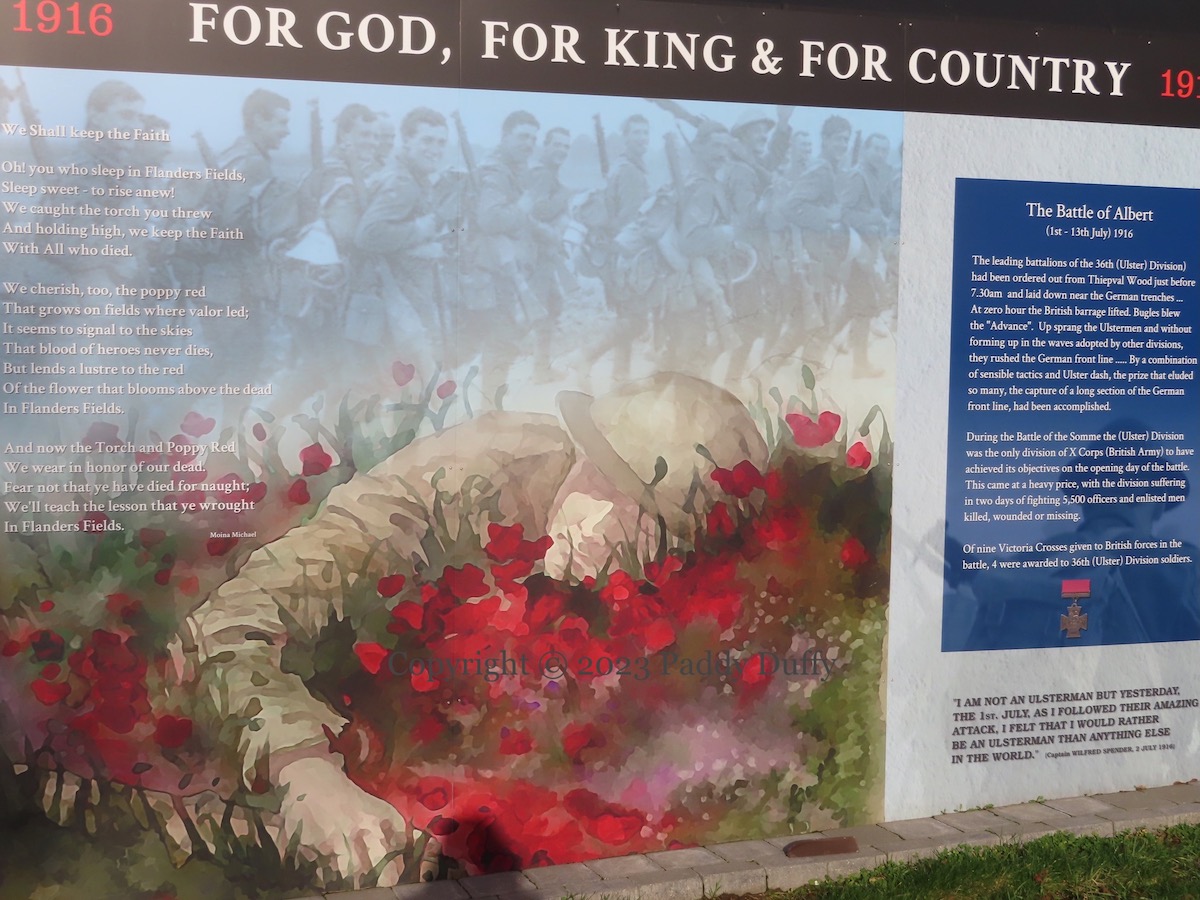 1916 – For God, For King & For Country – 1917: “The Battle of Albert (1st – 13th July) 1916. The leading battalions of the 46th (Ulster) Division) had been ordered out from Thiepval Wood just before 7.30am and laid down near the German trenches … At zero hour the British barrage lifted. Bugles blew the “Advance”. Up sprang the Ulstermen and without forming up in the waves adopted by other divisions, they rushed the German front line …… By a combination of sensible tactics and Ulster dash, the prize that eluded so many, the capture of a long section of the German front line, had been accomplished. During the Battle of the Somme the (Ulster) Division was the only division of X Corps (British Army) to have achieved its objectives on the opening day of the battle. This came at a heavy price, with the division suffering in two days of fighting 5,500 officers and enlisted men killed, wounded or missing. Of nine Victoria Crosses given to British forces in the battle, 4 were awarded to 36th (Ulster) Division soldiers.” With quotes from Wilfrid Spender (see I Would Rather Be An Ulsterman), and the poem We Shall Keep The Faith by Moina Michael. Please get in touch if you can identify the photo of soldiers going off to war at the top.