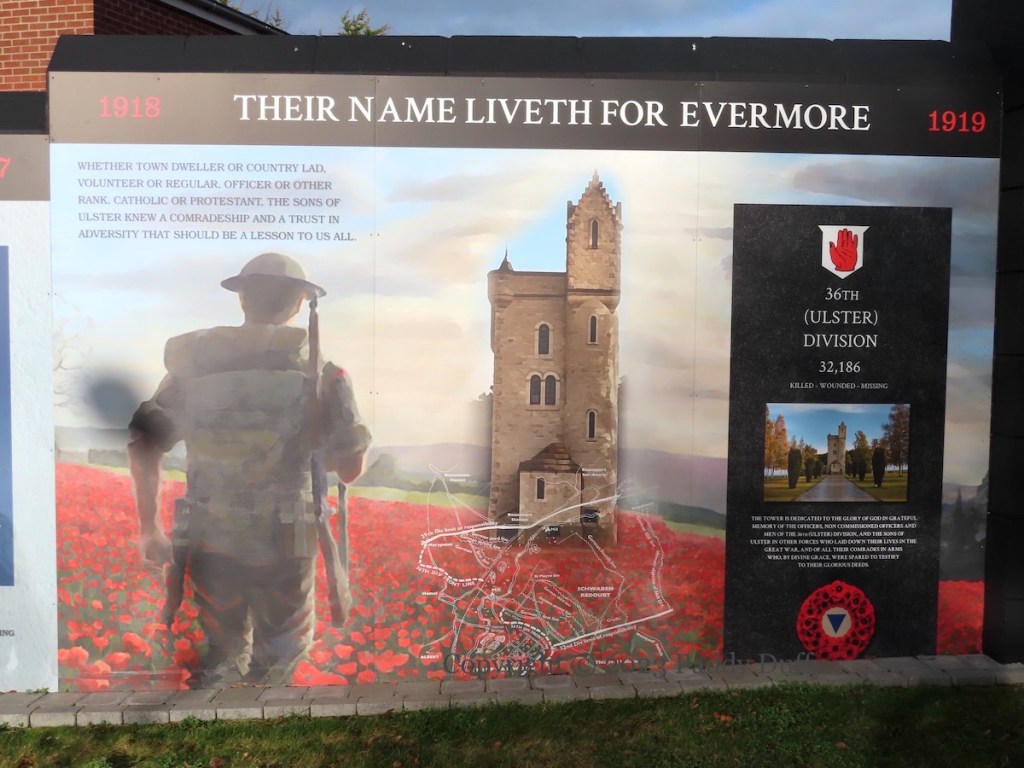1918 – Their Name Liverth For Evermore – 1919: “Whether town dweller or country lad, volunteer or regular, officer or other rank, Catholic or Protestant, the sons of Ulster knew a comradeship and a trust in adversity that should be a lesson to us all.” “36th (Ulster) Division 32,186 killed, wounded, missing. The [Ulster] tower is dedicated to the glory of God in grateful memory of the officers, non commussioned officers and men of the 36th (Ulster) Division, and the sons of Ulster in other forces who laid down their lives in the Great War, and of all their comrades in arms who, by divine grace, were spared to testify to their glorious deeds.”