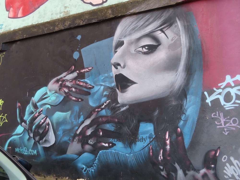 Here is the CNB15 piece by MELS2 (Fb), showing four bloody hands, with blood red nails, belonging to a blonde-haired, black-lipped woman looking askance at the viewer. The inspiration for the work is Dublin photographer Monika Lejman/Mona Leymann.