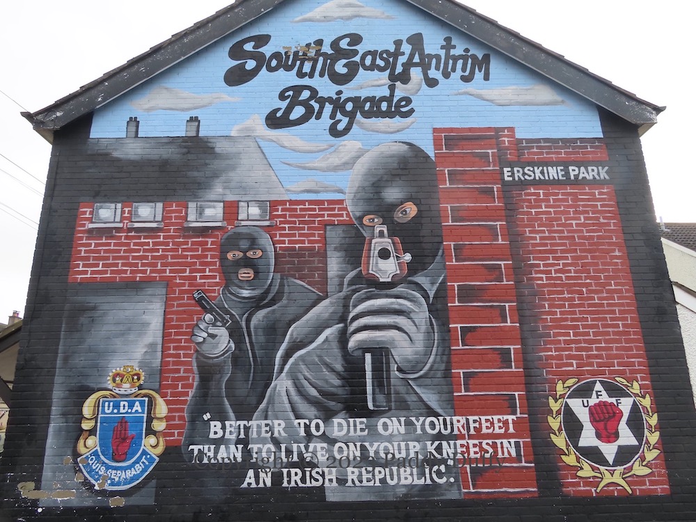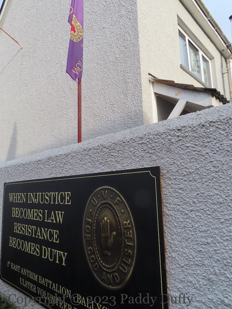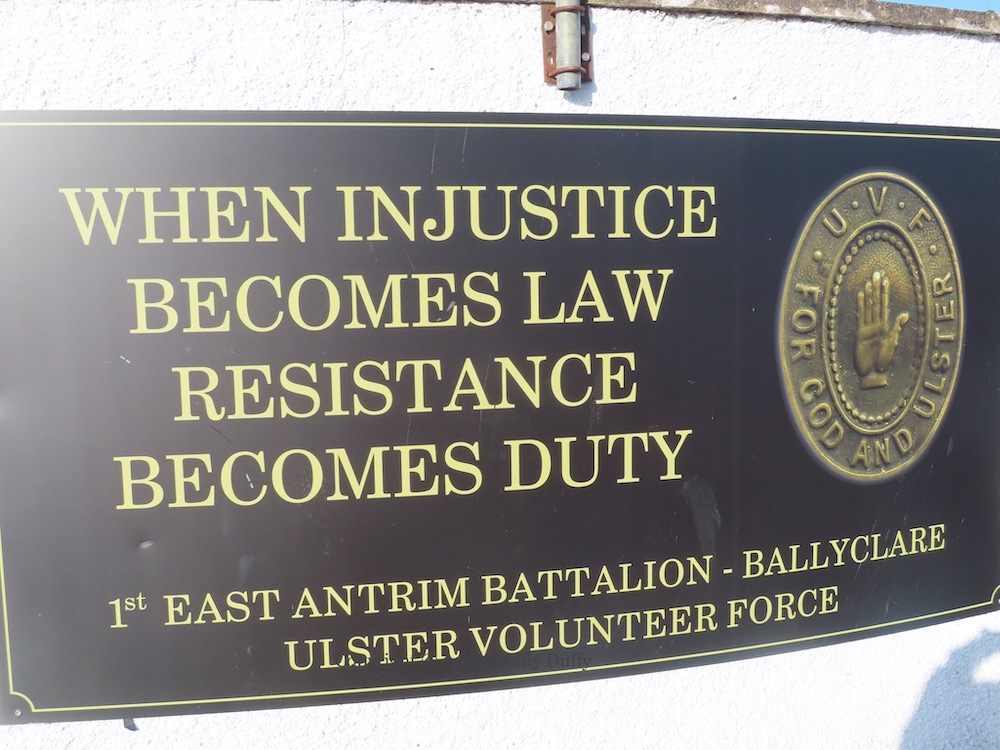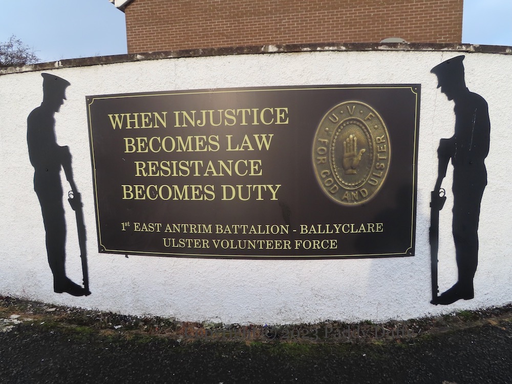 The phrase “When injustice becomes law, resistance becomes duty” is commonly but spuriously attributed to Thomas Jefferson (Monticello). It is used here by “1st East Antrim Battalion – Ballyclare – Ulster Volunteer Force” in the Grange and Erskine Park estates (Ballyclare) to protest Brexit and the NI Protocol. The graveside mourners, however, belong to WWI.