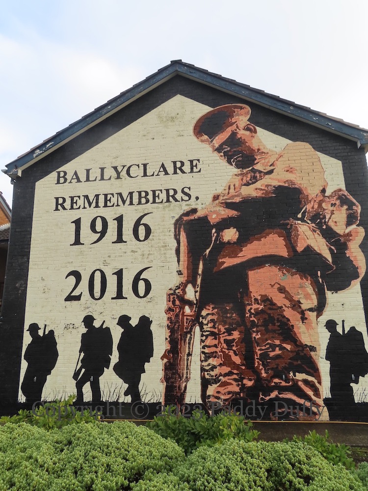 This is a UVF/YCV mural in Grange Drive, Ballyclare, celebrating and commemorating soldiers from the Ulster Volunteers who went on to serve in the 36th (Ulster) Division in WWI and in particular at the Somme. The central panel shows soldiers bearing the Division’s standard (painted in colour in an otherwise black-and-white mural and in the style of the (US) Marines ‘Iwo Jima’ Memorial (WP)) which comprises the Union flag, harp insignia of the Royal Irish Rifles, and the red hand of Ulster on a field of shamrocks.