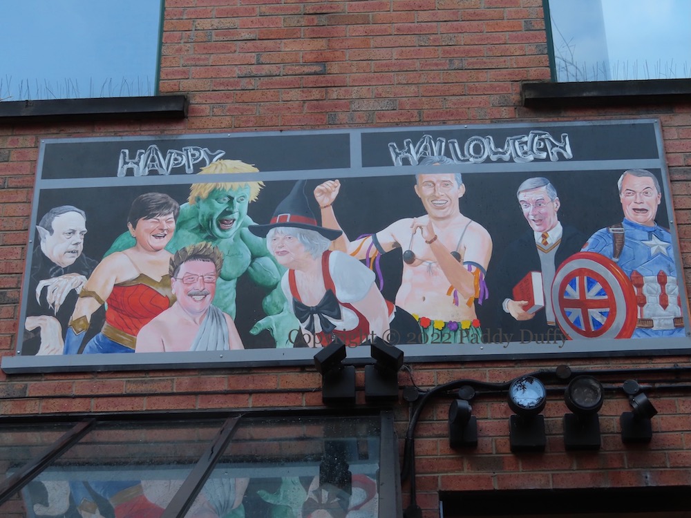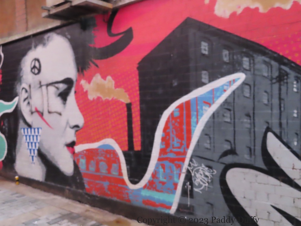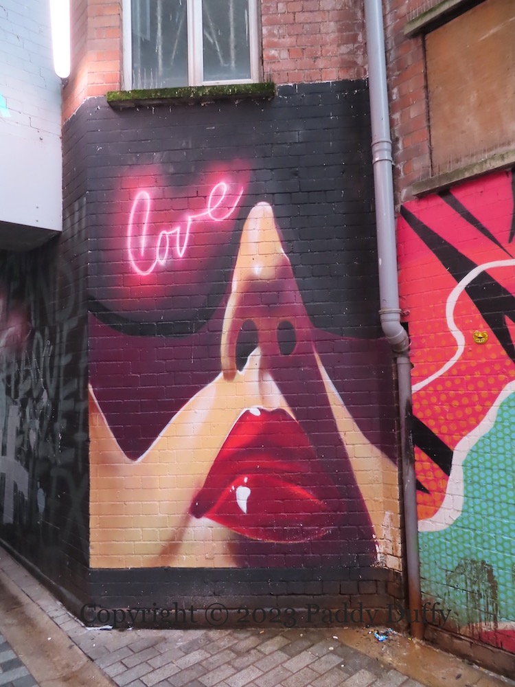 The piece is by Irony (tw | ig | Fb | tumblr). According to Adam Turkington, Irony was inspired by “the commercial themes in Ciaran Carson’s many visions of Belfast” (Belfast Live). (Belfast Confetti was the inspiration for emic’s piece in Winecellar Entry.)