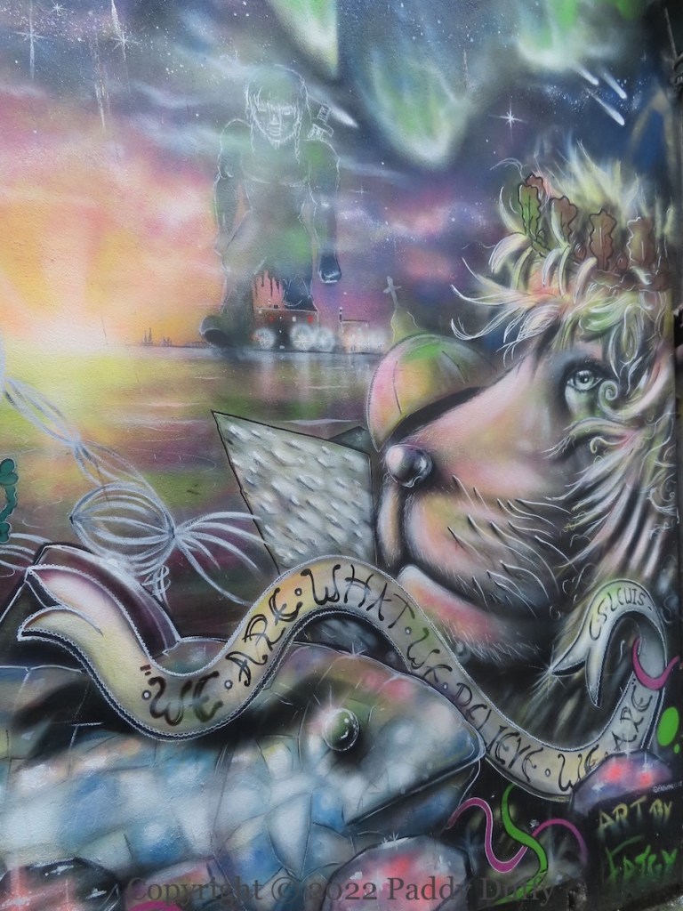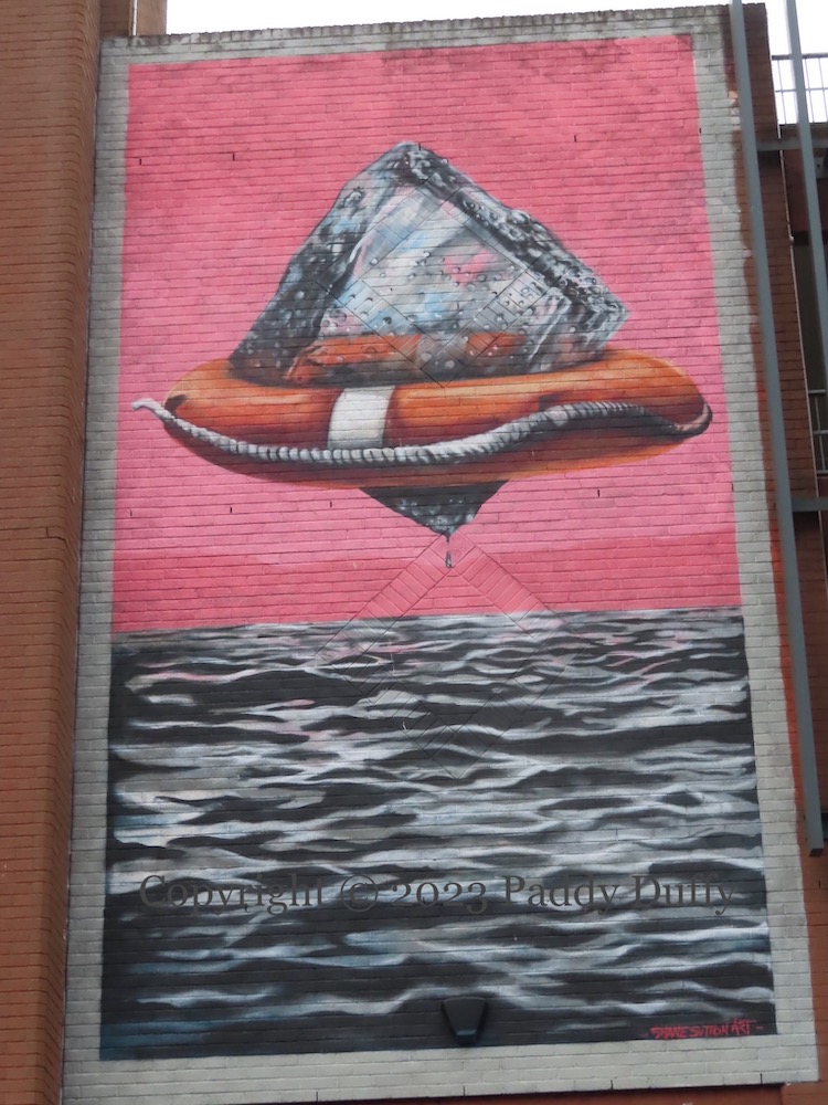 A ship’s figurehead (perhaps) cranes upwards – as the viewer must also do – in front of a background of decaying tile-work. Perhaps the decay is being left behind? In any case, Belfast City Council thought a suitable symbol of Belfast moving onward and upwards when used the art to announced the Belfast Stories project (tw; see The Rising Place).