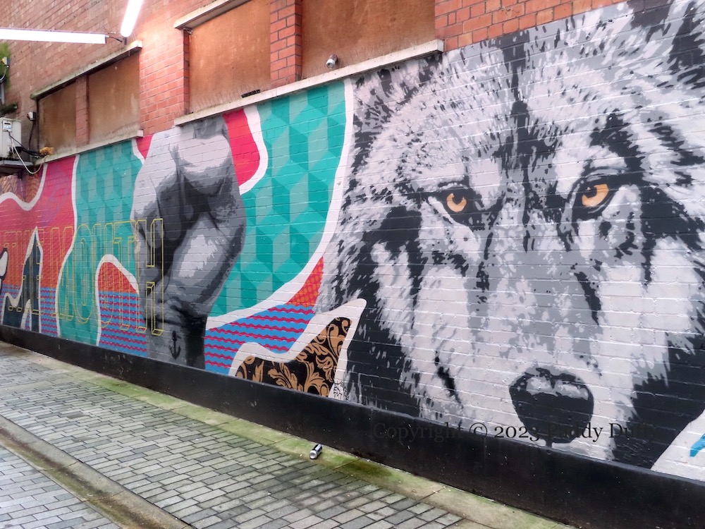 In Pottinger’s Entry. There is a separate Visual History page on the Belfast entries and the recent (2020 onward) efforts to beautify them.