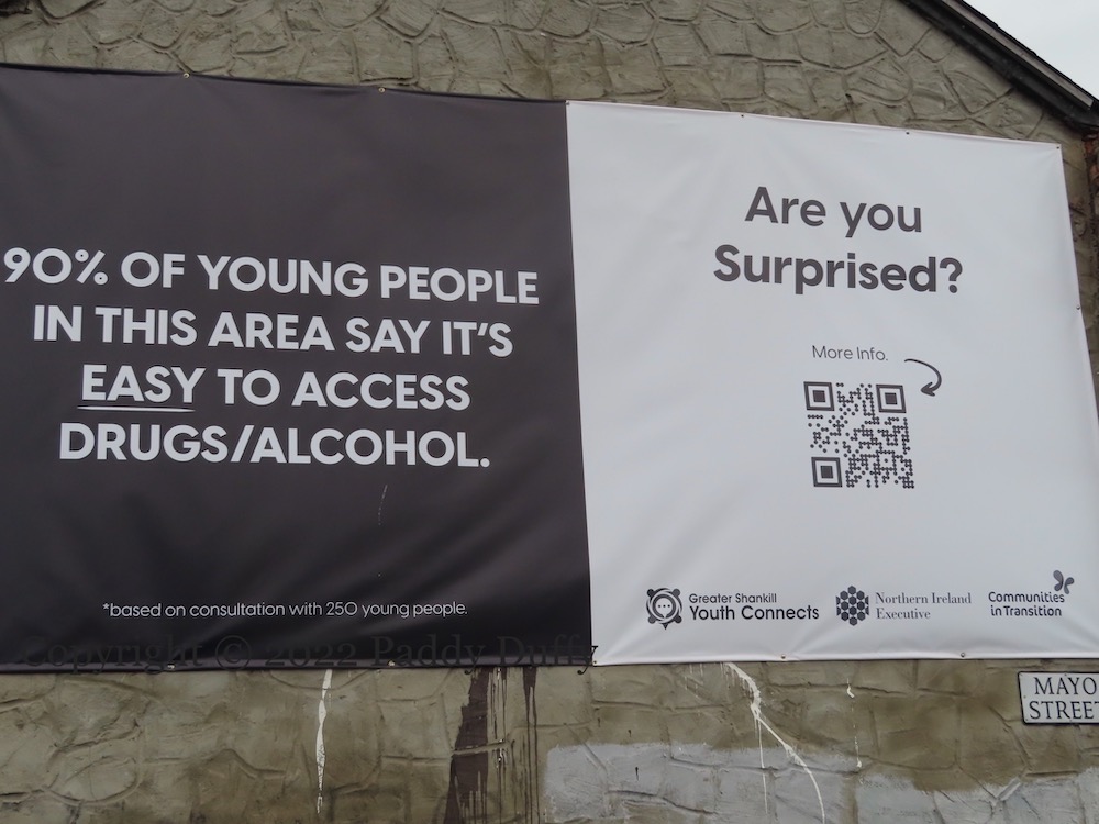 “90% of young people in this area say (based on consultation with 250 young people) it’s easy to access drugs/alcohol. Are you surprised?” For more on this campaign by Greater Shankill Youth Connects (Fb) promoting their “Shankill Talks” forums, see Belfast Live.