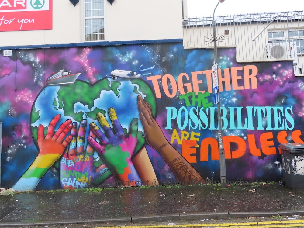 This east Belfast mural showing hands of many colours holding up a heart-shaped earth was produced last year in tandem with a diversity night in memory of the Pakistani-born owner of the Spar on whose side it is painted (Belfast Media).