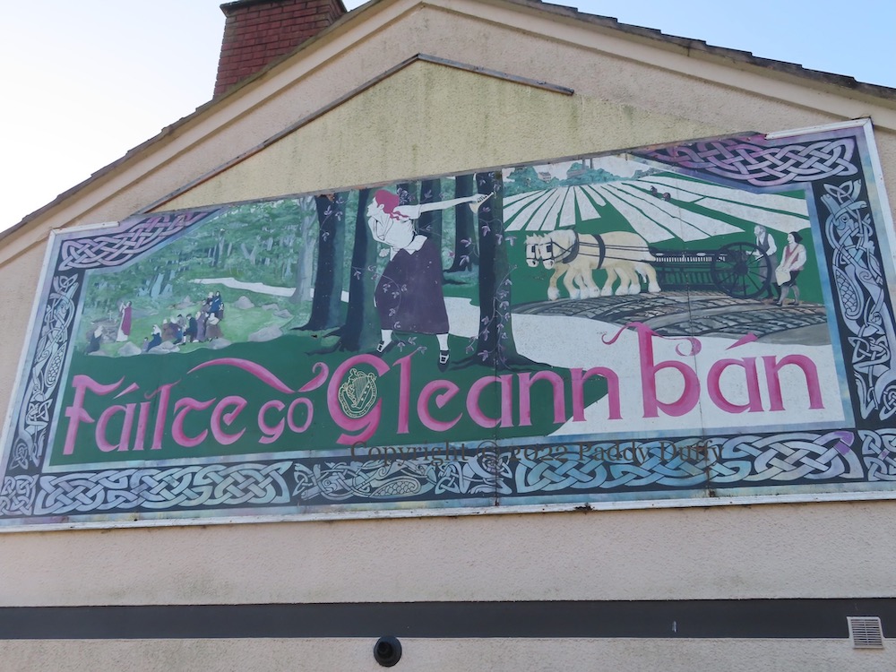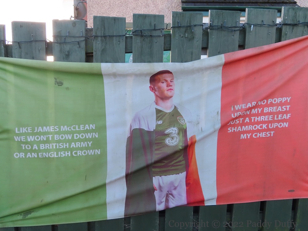 Here are two soccer-related images from Gardenmore Road, in Twinbrook. Above, James McClean in his Ireland strip – “Like James McClean we won’t bow down/To a British Army or and English crown.//I wear no poppy upon my breast/Just a three leaf shamrock upon my chest.” (though McClean is shown wearing the 2016-2018 jersey which featured a ball rather than an FAI shamrock).