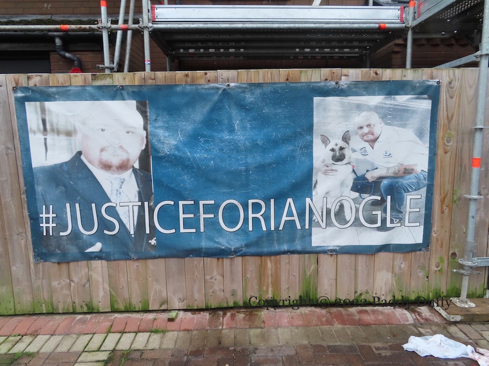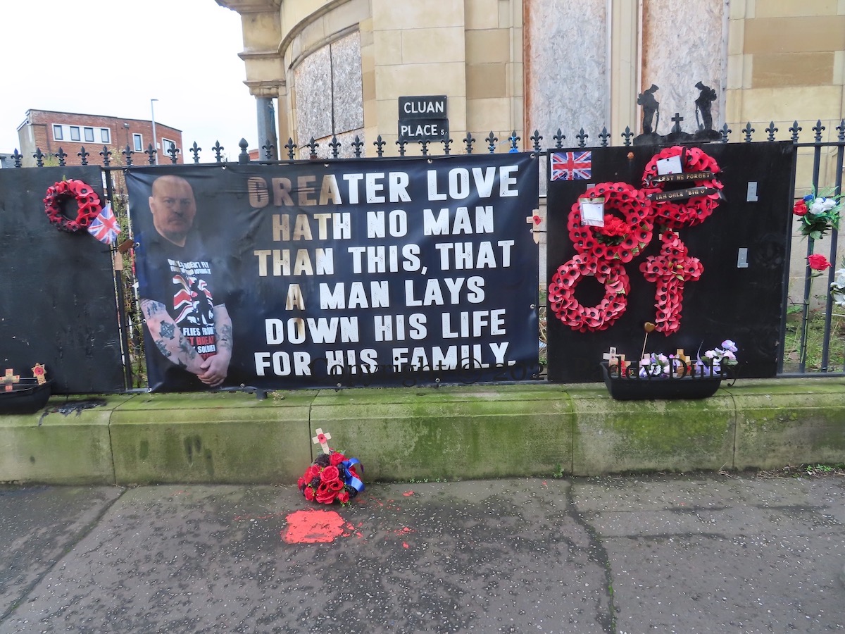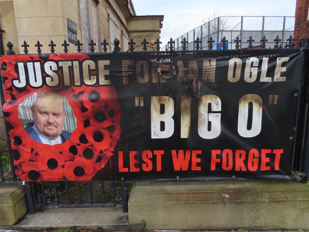 The memorial tarps to Ian Ogle at the entrance to Cluan Place were photographed on October 5th and appeared – unmolested – in For His Family. On about the 18th of November they were subject to an arson attack. Belfast Live has reaction from the family.
