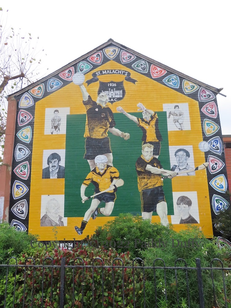 St Malachy’s (tw | Fb) is a junior (i.e. 2nd division/B-tier) GAA club established 1936 in the Markets area of south Belfast. It is not known who the six portraits are of (there were originally only the four at the corners – see M08137) or who the four players are. Get in touch if you have any information.