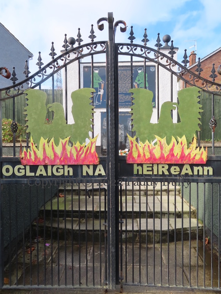 The wrought-iron gates depict a phoenix and “Óglaıgh Na hÉıreann”.