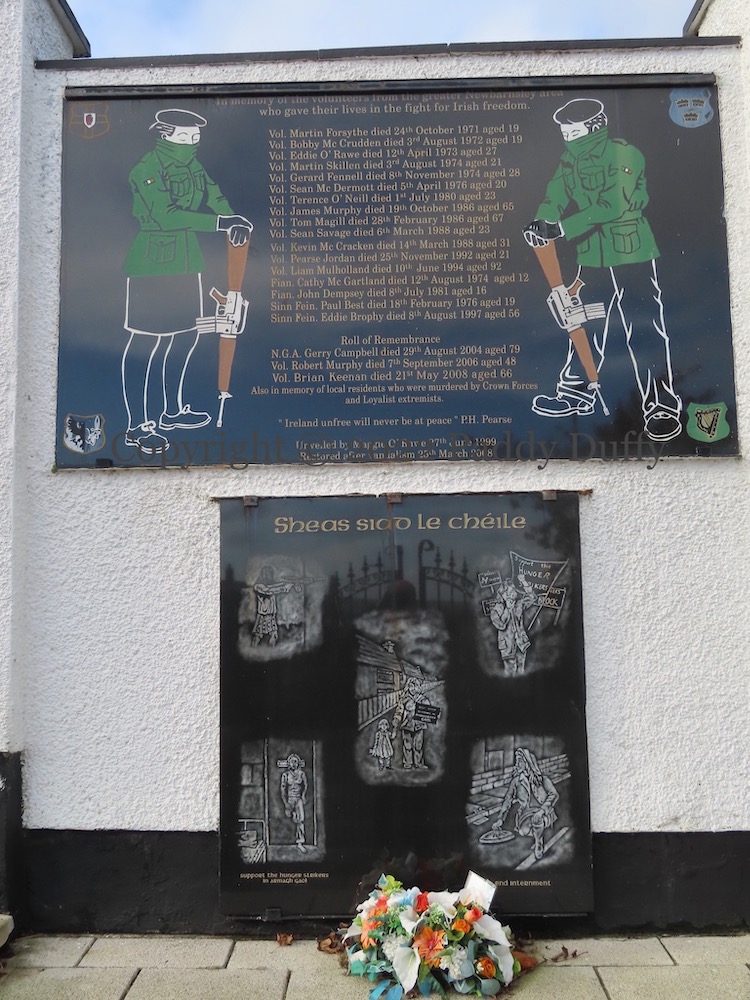 “In proud and loving memory of all local volunteers, prisoners of war, republican activists and the unsung heroes who died of natural causes having served the cause of Irish republicanism [“sean óglach” on the individual plaques]. Together in unity you formed a bond which gave true meaning to the undefeated risen people. Your deeds of bravery and resistance will never be forgotten by the people of greater St. James’s. In your honour the quest for Irish freedom continues.” With the famous “our steps will be onward” quote from Máıre Drumm at an anti-internment rally in Dunville Park on 10th August, 1975 (RN). Coıste Cuımhneacháın Lár Na bhFál/Ard Na bhFeá [Memorial committee of mid-Falls/Beechmount]. For some more of the plaques, see The Unsung Heroes.