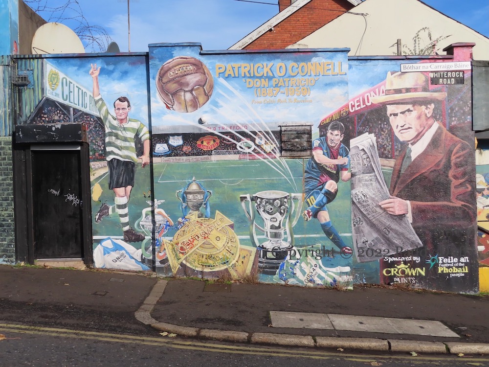 The stands of three football stadiums are shown in the background: Belfast Celtic’s Celtic Park (“Paradise”), Manchester United’s Old Trafford, and Barcelona’s Camp Nou. The Old Trafford stands bear the emblems of the teams Patrick O’Connell played for and managed: Liffey Wanderers (whose shirt is also featured, on the left), Sheffield Wednesday, Hull City (The Tigers), Manchester United, Dumbarton, Real Racing Club de Santander, Real Oviedo, and Real Betis Balompié (also shirt on the right).
