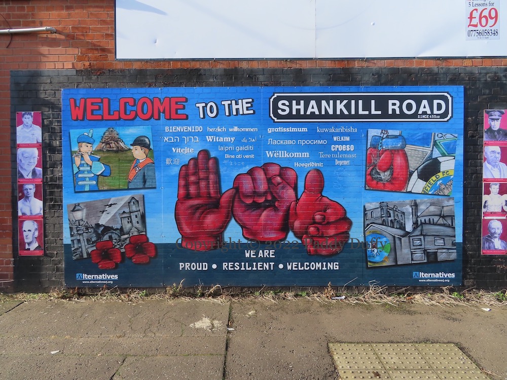 The mural is a version of the old Beverley Street ‘welcome’ mural (by Blaze FX), with the same four panels (parades/bonfire, blitz, sports, murals) and the same three hands. But instead of “Proud, Defiant, Welcoming” we now have “Proud, Resilient, Welcoming”. (I Am Not Resilient in the lower Shankill complains that the word is used to justify neglect and/or maltreatment.)