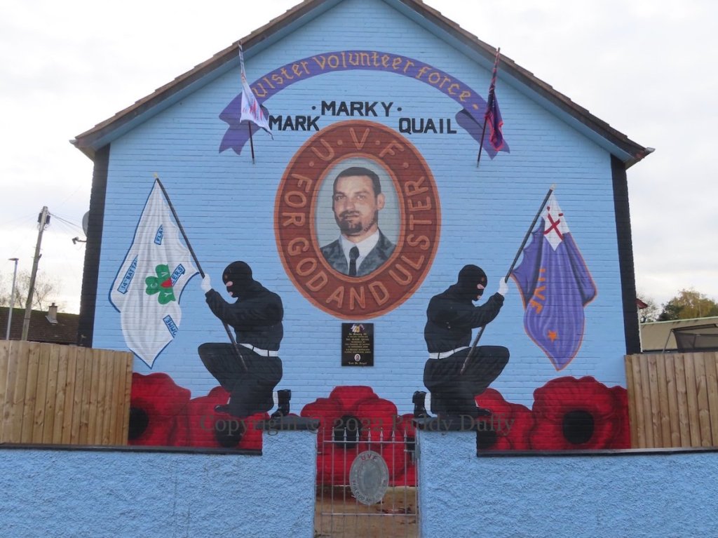 Ulster’s defenders, past and present, from Cuchulainn “Ancient defender of Ulster from Gael attacks”, via the 1893 UDU and WWI soldiers memorialised in the towers at Messines and Thiepval, to the modern UDA/UFF: “In memory of the officers and volunteers of A. Coy. UDA/UFF West Belfast Brigade who unselfishly dedicated their lives in defence of their country.”