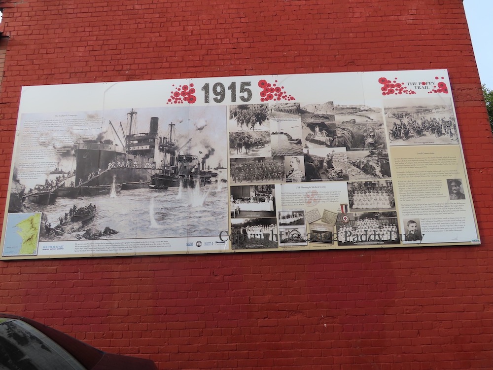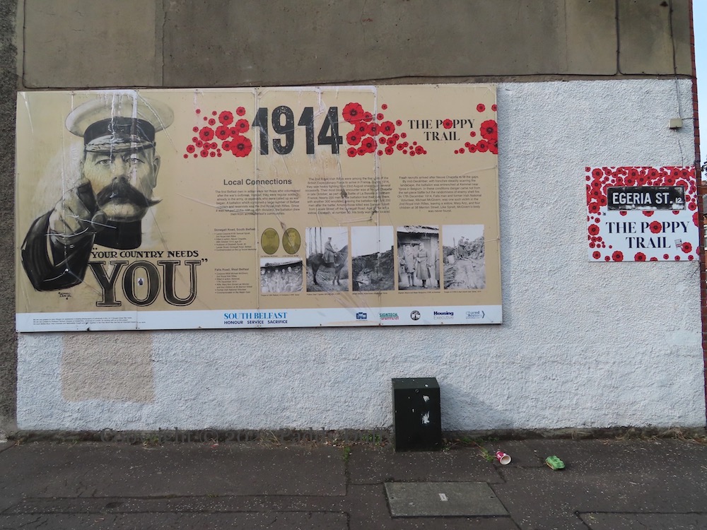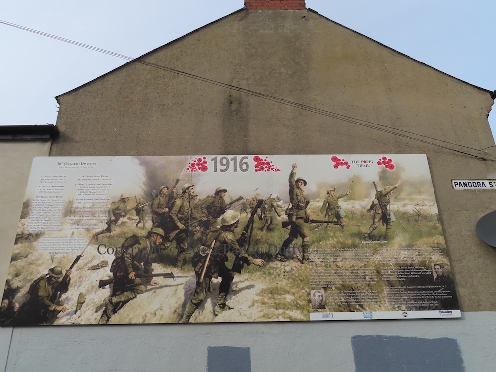 In the 1916 board, JP Beadle’s Battle Of The Somme, Attack Of The Ulster Division is reproduced in the 1916 installment of the Poppy Trail in south Belfast. (For more on the painting, see belfastsomme.com.) In addition to listing local men lost in on July 1st – from places such as Roden, Matilda, Kitchener, Barrington, Blythe, Ebor, Rowland, Abingdon, and Combermere Street – it also features an individual from each community who served and died, in this case, Rifleman Paul Irvine from Lower Rockview Street and Private Patrick McGinney from Balkan Street (in the Divis area).