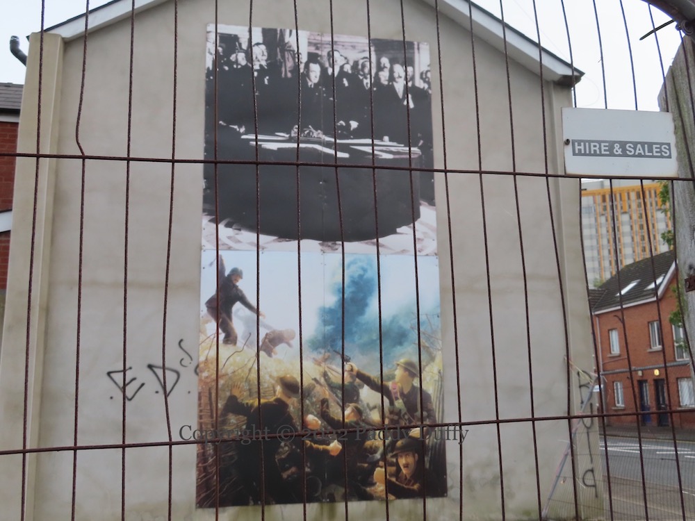Here are a pair of boards in Barrington Gardens, Belfast: above, the signing of the Ulster Covenant, on September 28th, 1912; below, an attack on British trenches, perhaps intended to represent a scene from the first day of the Battle Of The Somme, July 1st, 1916.