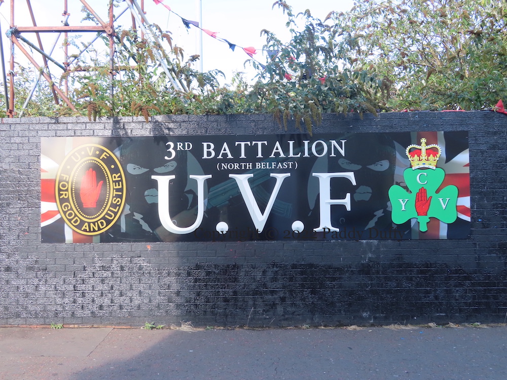 In 2021, after a ten year run, the Crusaders FC mural (2010 | 2012) was reverted (1996 D00711 | 2002 J1204) to a UVF hooded gunman mural.