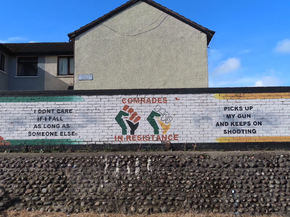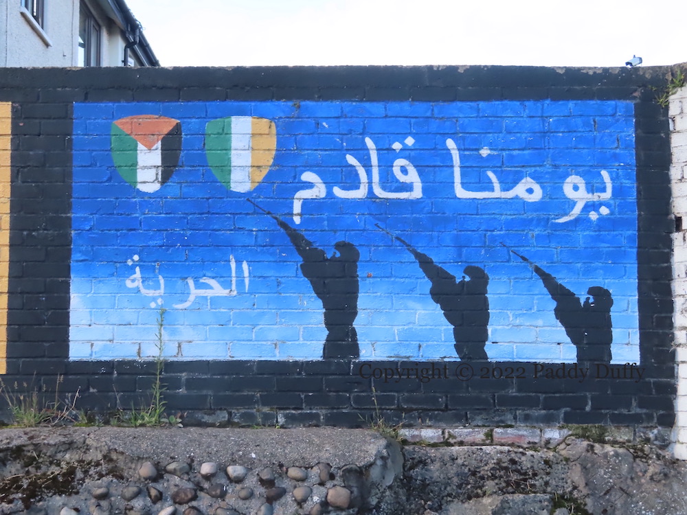 A Che Guevara quote – “I don’t care if I fall as long as someone else picks up my gun and keeps on shooting” – unifies two panels bearing masked men firing funeral volleys, Irish and Palestinian shields, and “Our day will come” in both Irish and Arabic.
