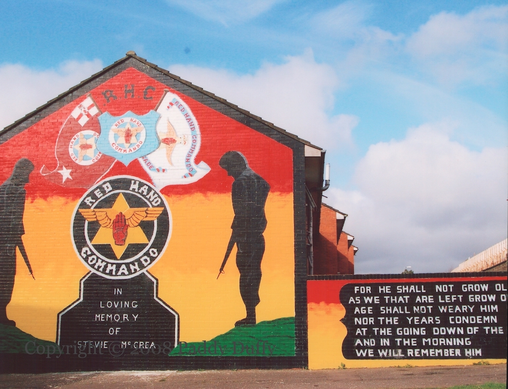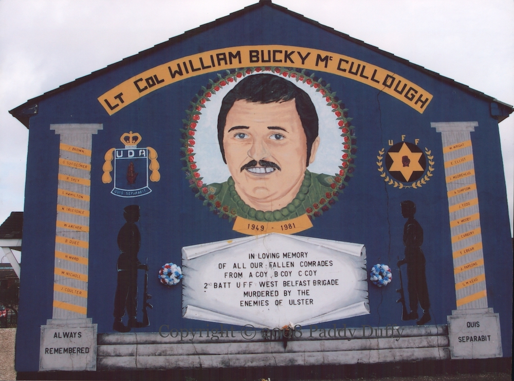 “In loving memory of all our fallen comrades from A Coy, B Coy, C Coy, 2nd Batt UFF West Belfast Brigade. Murdered by the enemies of Ulster.” UDA Lieutenant-Colonel McCullough was killed by the INLA on October 16th, 1981, outside his home in Denmark Street (out of frame to the right), on information supplied by fellow UDA member James Craig, who feared that McCullough would expose his embezzling of UDA funds.