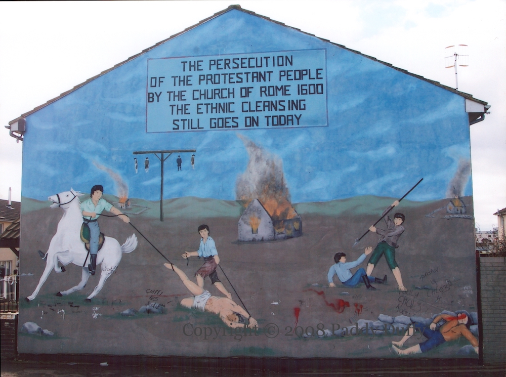 The mural shows people being hanged, speared, and drawn behind a horse, and houses in flames.” The persecution of the Protestant people by the church of Rome, 1600 [probably the Irish Rebellion of 1641 (WP)] – the ethnic cleansing still goes on today.”
