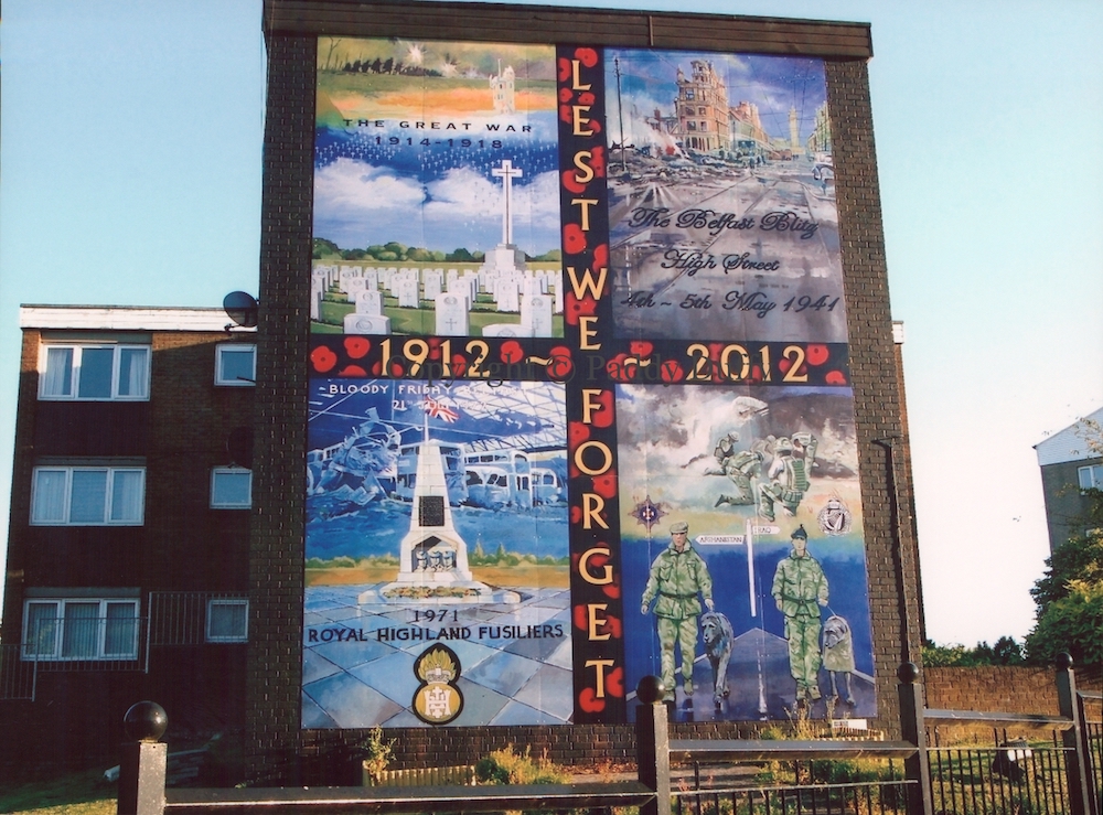 The three-storey mural above is in Ballysillan and replaced a UVF mural when it was added in 2011. The mural is the work of Jim Russell while artist-in-residence at Arts For All. The information below was provided by Arts For All.